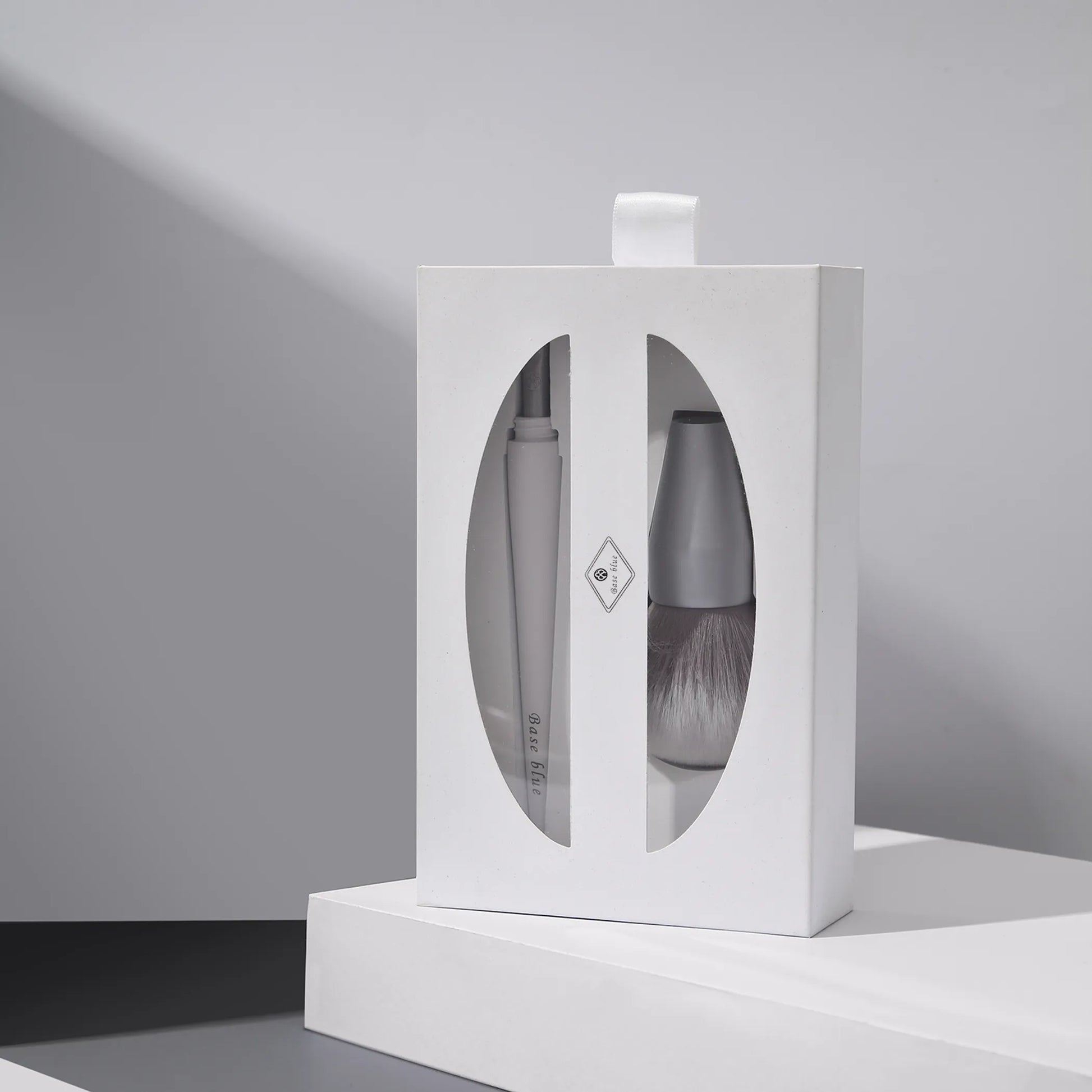 Compact eyeshadow brush and powder brush makeup tool. There's more to the 2-in-1 Makeup Brush "A" than what meets the eye! The first to debut from Baseblue's recursive dual brush series, the beauty tool features two different brush styles in a stacked, twistable design with a comfort grip handle. The soft synthetic bristles are perfect for capturing loose and pressed powder applications with the voluminous brush head. Get just the right amount of coverage when targeting areas around the forehead, cheeks and neck. Transform the multi-use brush by twisting off the top head to reveal the small angled eyeshadow brush that is dynamic for applying eye powders and touching up small facial curvatures. MAKEUP BRUSH TIPS: This duo makeup brush set does the work for you to apply face makeup for a flawless, even finish. Featuring ultra plush hairs with a lightweight soft-touch handle, the 2-in-1 Makeup Brush "A" is designed to be your blending brush essential to cut down makeup time with its twist and switch component. The fluffy brush style can be used with a multitude of makeup techniques and essentially does the blending and highlighting for you. When you're ready to apply eye makeup, twist the powder brush off to reveal the tapered brush underneath. The small flawless brush tool is ideal to apply eyeshadows on lids, concealer under your eyes, and other hard-to-reach spots. Tap makeup over scars and tackle small blemishes, or blend out eye makeup applications precisely. Achieve airbrushed perfection on the go with a dual makeup tool that's ideal for storage, travel and touch-ups throughout the day.