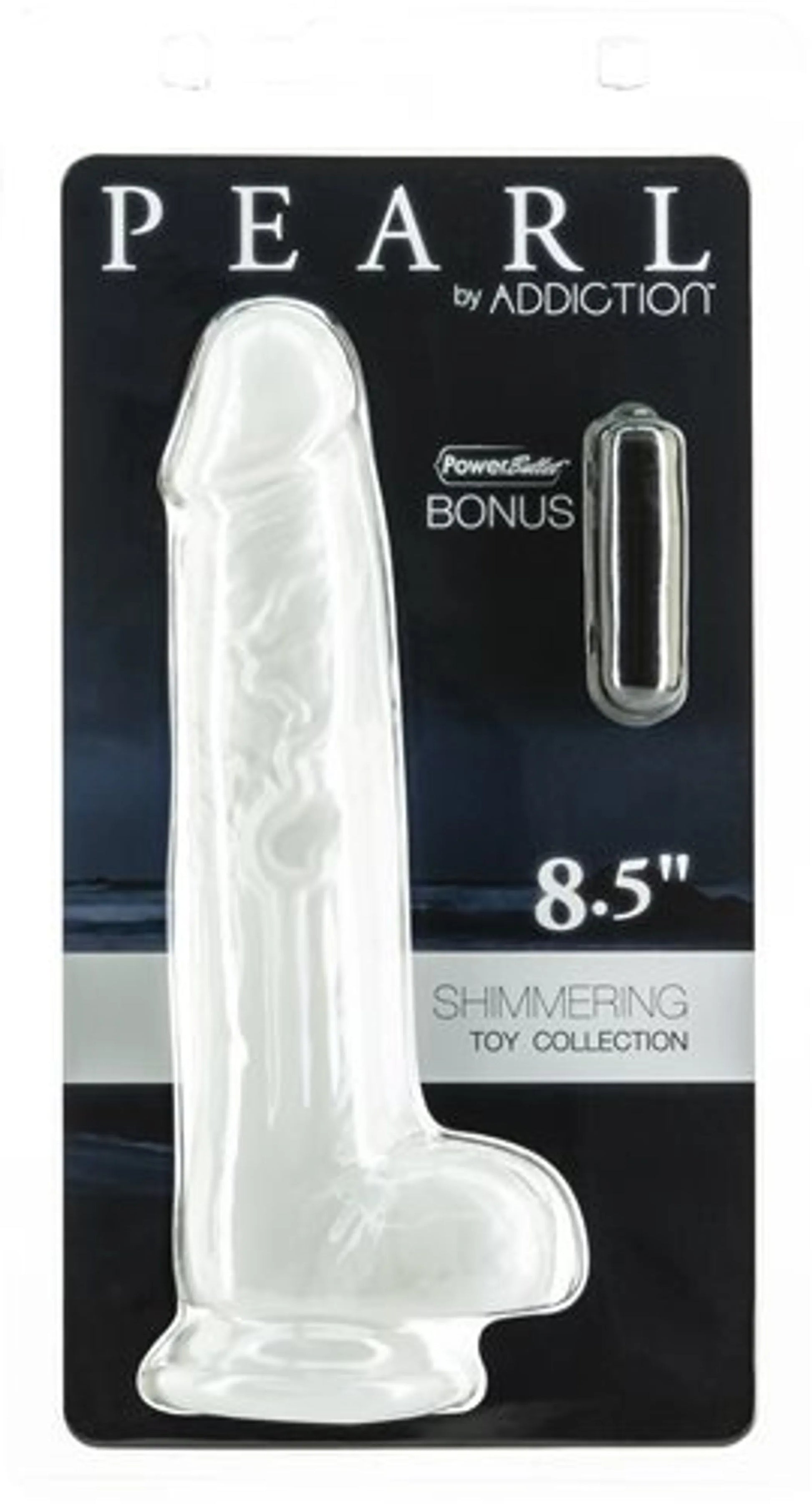 Addiction Pearl 8.5 inches Dong White Thermoplastic Elastomers TPE with Bullet from BMS Enterprises. A pearl is a lustrous, shimmering gem that symbolizes all things precious and beautiful. The Pearl shimmering toy collection from Addiction shines, reflects and glistens with a pearlescent finish. The sturdy suction cup base allows you to attach your Pearl to any flat surface for extended pleasure and fun. Harness compatible, this Pearl Addiction will have you coming back for more! Made of body safe TPE material that is easy to clean and safe to use on all your most delicate areas. Key features: 8.5 inches Pearl dildo. Shimmering pearlescent finish. Sturdy suction cup base. Harness compatible. Easy to clean. Body safe TPE material. Bonus Power Bullet Vibrator included. Categories: Dildos, Dongs, Realistic Large Dongs, Dildos and Dongs Realistic. Restricted, Amazon Restricted. 2023._x000D_