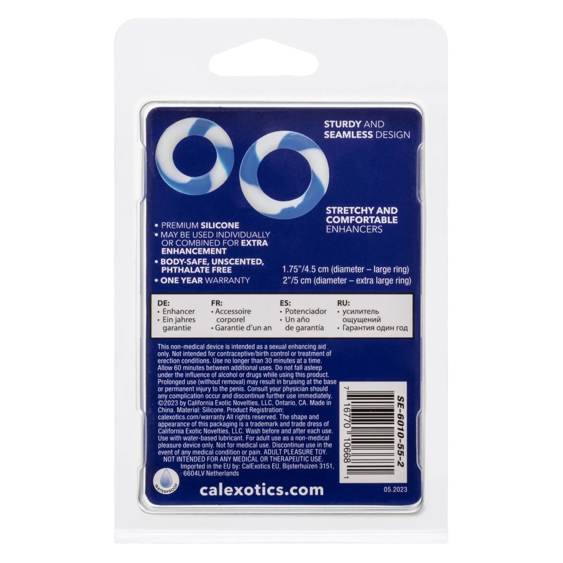 Admiral 2 Ring Set from California Exotic Novelties. Introducing the Admiral 2 Ring Set, a versatile set of premium Silicone enhancers designed to enhance your performance and pleasure. This set includes two gradually sized rings made from stretchy, comfortable and sturdy Silicone. The seamless design of the Rings ensures a smooth and comfortable fit, allowing you to focus on your pleasure without any distractions. Whether used individually or combined, these Rings provide extra enhancement and support, helping you achieve and maintain stronger and longer lasting satisfaction. Made from body safe Silicone, the Admiral 2 Ring Set prioritizes your safety and comfort. The Silicone material is body safe, ensuring a worry free and enjoyable experience. Explore new levels of pleasure and performance with the Admiral 2 Ring Set. Whether you are looking to boost your stamina or enhance your sensations, these premium Silicone Rings are here to fulfill your desires. Discover the benefits of increased sensitivity, and prolonged pleasure with this versatile and effective set. Specifications: SKU SE-6010-55-2. Color Multi-colros. 1 year warranty. Features: Wearable, Phthalate free. Waterproof, non-vibrating cock rings. Material type Silicone. Measurements: 1.75 inches diameter large ring. 2 inches diameter extra large ring. Bulk weight 1.1 ounces. Package 2 ounces. Package 0.5 inch by 4 inches by 6 inches. Categories: Love Rings, Sex Toys for Couples, Men, Women, Cock Rings, Sleeves and Rings. 2024.