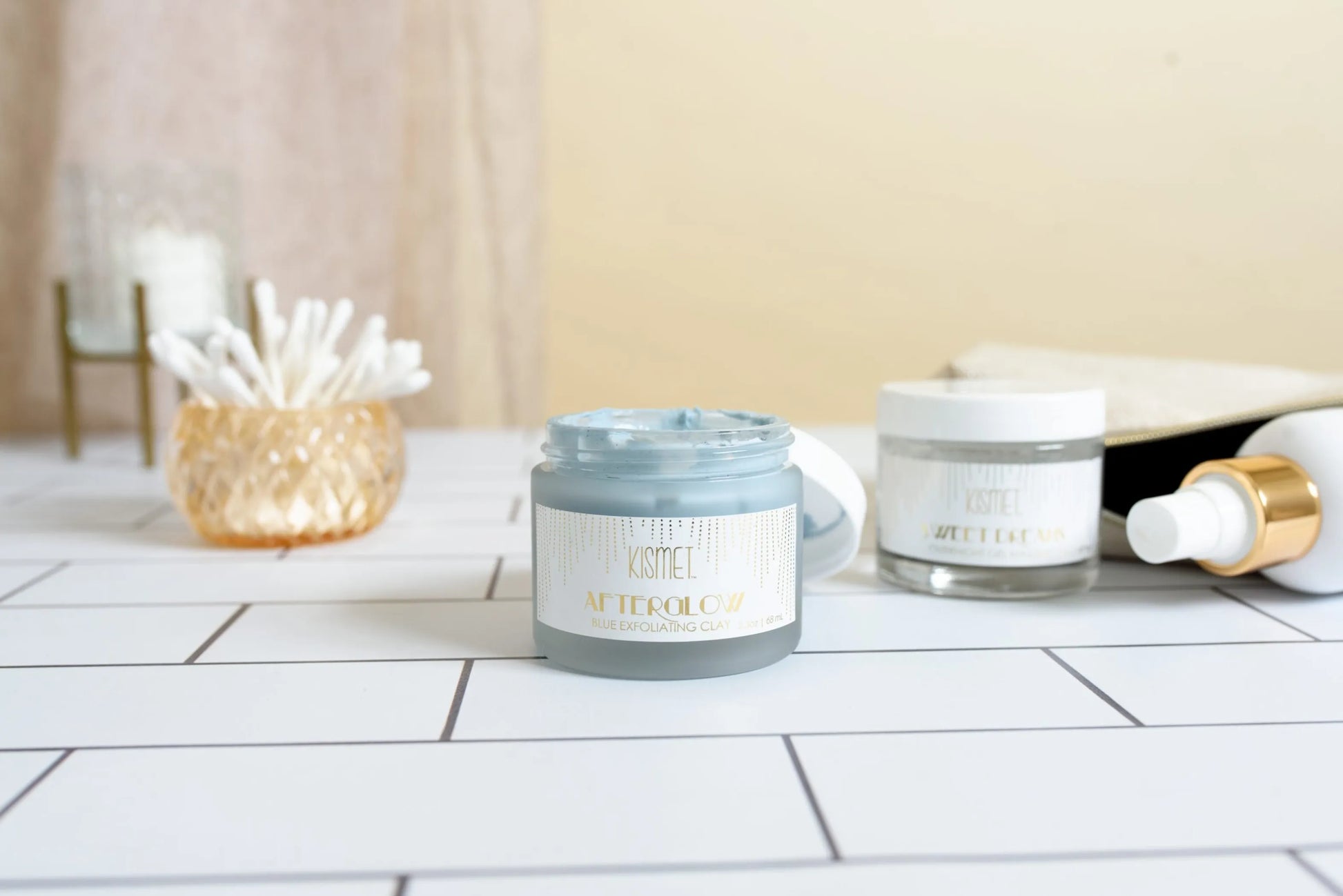 Afterglow is a deep blue exfoliating clay that not only buffs dead skin away, but also draws out impurities while fighting aging at the same time. We use a 'green' starch-based exfoliating agent called Polylactic Acid, that removes skin impurities for a deep skin cleansing that will give you clear results after the first use. This powerful scrubber is blended with a naturally occurring soft clay, Kaolin, that helps to cleanse and exfoliate dead skin cells and debris from the surface. Together they are a powerhouse. One scrubs the dead skin and the other helps to remove it from your pores.