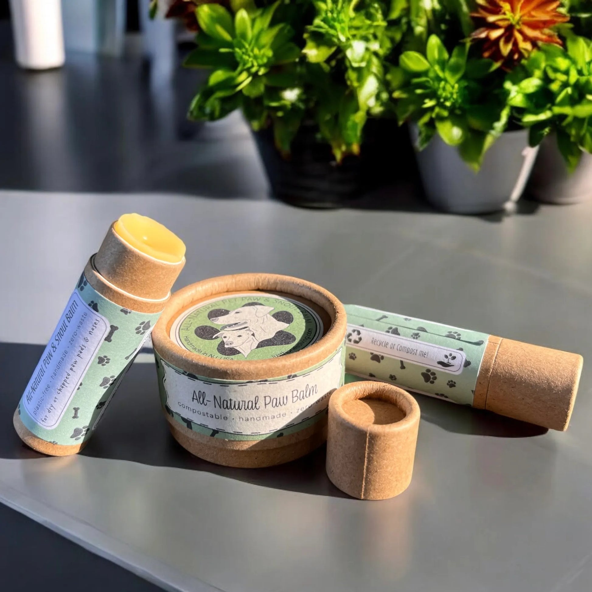 This handy paw balm is made with natural butters and oils infused in-house with Calendula Petals, which have many anti-inflammatory and other beneficial properties for humans and pets alike. They can help soothe skin irritations or burns, help with wound healing, and help relieve inflammation and redness. This sustainable salve is perfect to help soothe chapped skin on dog's paw pads or noses during the winter or can be used to help in the healing process for other skin wounds or irritations*. It comes in a compostable kraft .33oz push up-tube or 1oz pot, or a 4oz recyclable aluminum tin for long-term use. Ingredients: Extra Virgin Olive Oil infused with Calendula Flowers, Beeswax, Mango Butter, Shea Butter, Coconut Oil, Vitamin E, Rosemary Oleoresin Extract, Lavender Essential Oil *Directions/Caution: Do not apply to open wounds. Push up from the bottom of the tube or scoop out a small amount of product from the container and rub in gently/briefly to the affected area. Apply 1-2 times a day, as needed. Keep away from moisture or extreme heat (ex. do not leave in a hot car) to maintain full use and freshness. Disposal: Recycle or compost the paper containers or clean out and reuse the tin as much as possible before recycling. Made in the U.S.A. Click on the brand name and our About Us page to see how else this purchase contributes to environmental conservation & sustainability efforts
