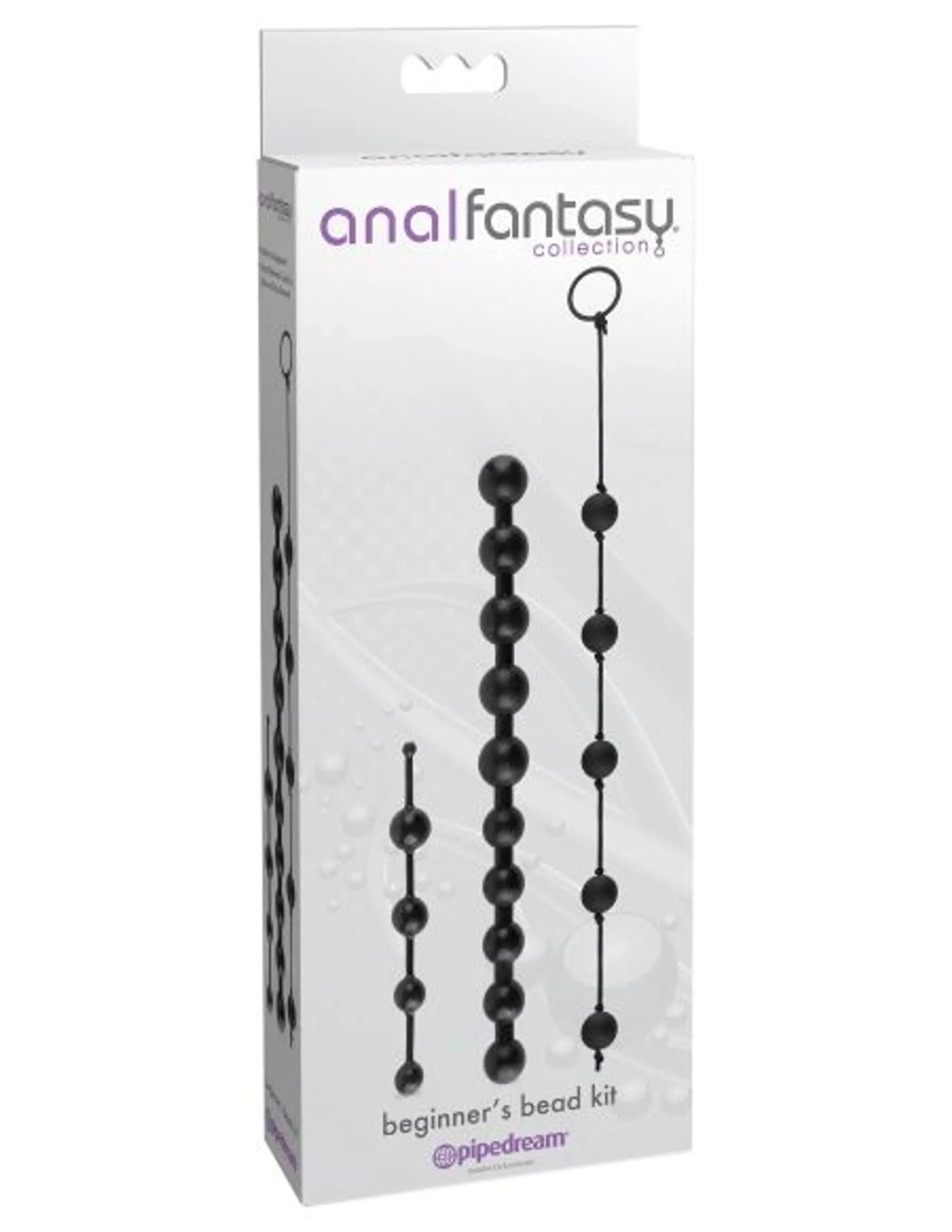 Anal Fantasy Collection Beginner's Bead Kit from Pipedream Products. If you have never tried anal play, this Beginner's Bead Kit is just what you need to explore the amazing world of anal stimulation. Begin with the smallest set of beads, which features a tip of just .5 inch to ease insertion before gradually expanding to .75 inch. Once accustomed to the size, experiment with the stringed beads before graduating to the largest set. No. 1 and No. 2 feature a flexible shaft that bends with your body's contours to hit just the right spot, while the sturdy retrieval cords of No. 1 and No. 3 offer safe and easy handling. Be sure not to insert the very last bead of No. 2, as you will need it to handle the item. Anal Fantasy Kit with 3 different styles to help you ease into comfort. Clean up afterwards. No. 1 Anal Fantasy Beginner's Beads insertable length 5 inches. diameter .75 inch. No. 2 Anal Beginner's Anal Beads insertable length 9.75 inches, diameter 1 inch. No. 3 Anal Fantasy Beginner's Anal Beads 14 inches in total length, diameter .75 inch. Made using ABS Plastic and Nylon. 90 days warranty. Categories: Anal Toys, Sex Toys for Couples, Anal Beads, Anal Trainer Kits. Video added. 2022.