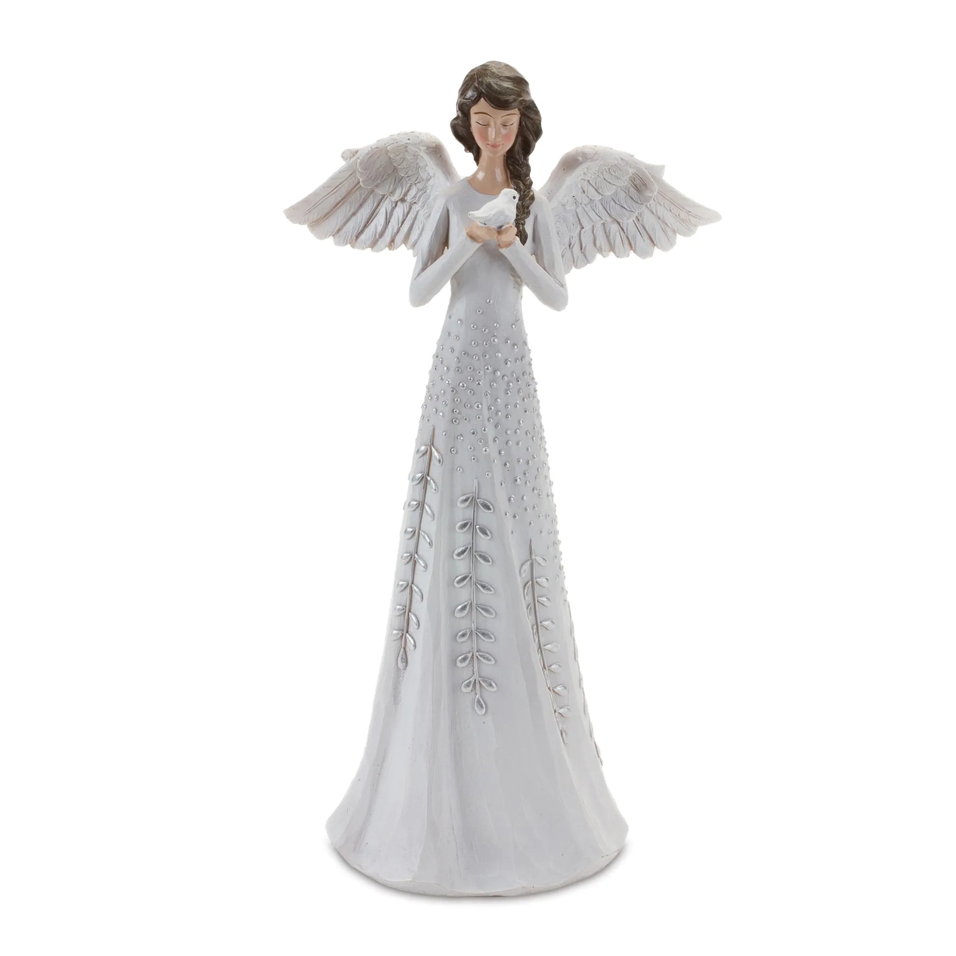 Make your holidays truly special with this set of Angel Figurines from our collection. Crafted from polyresin material, these beautiful figurines feature a praying design and bird accent in a white finish with silver accents for a timeless look. Perfect for adding a touch of faith to your holiday decorations - bring home this set of Angel Figurines today!