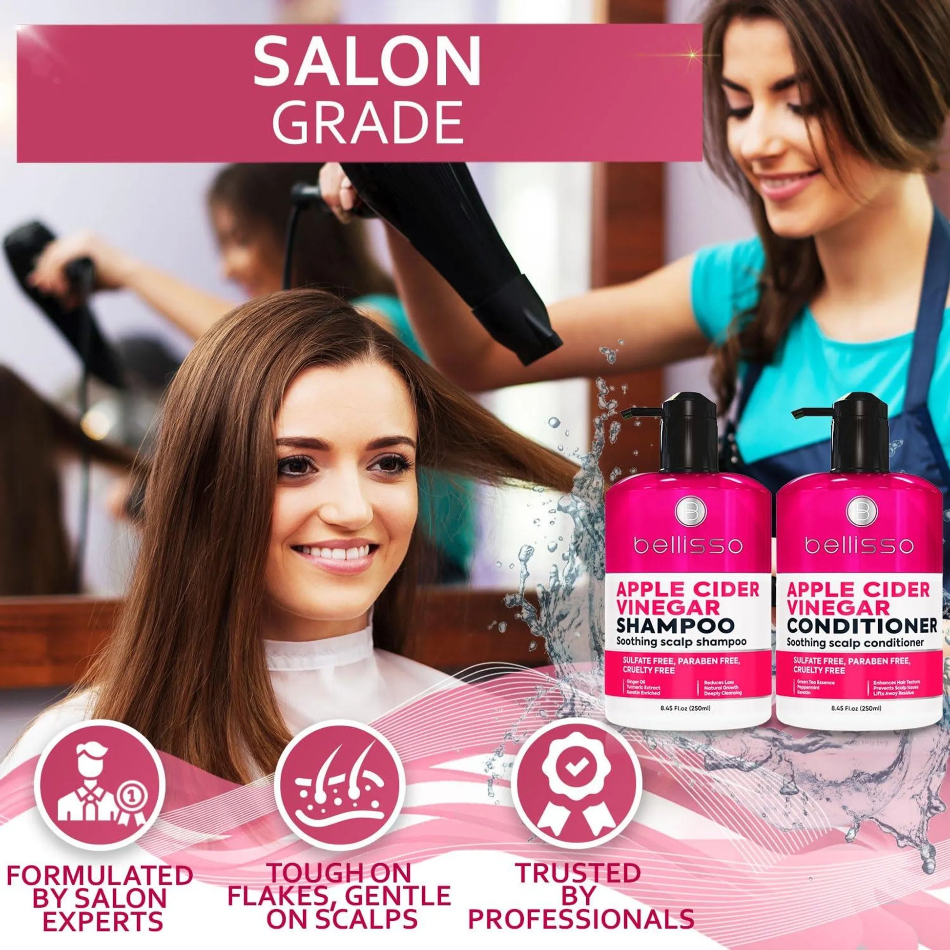 CALMS ITCHY SCALPS: This apple cider vinegar shampoo and conditioner from Bellisso has been specifically formulated to fight itchy and flaky scalps; As part of an advanced dry scalp treatment, our conditioner and shampoo for oily hair promises to remove excess grease and buildup, helping to balance Ph and fight the cause of flakes