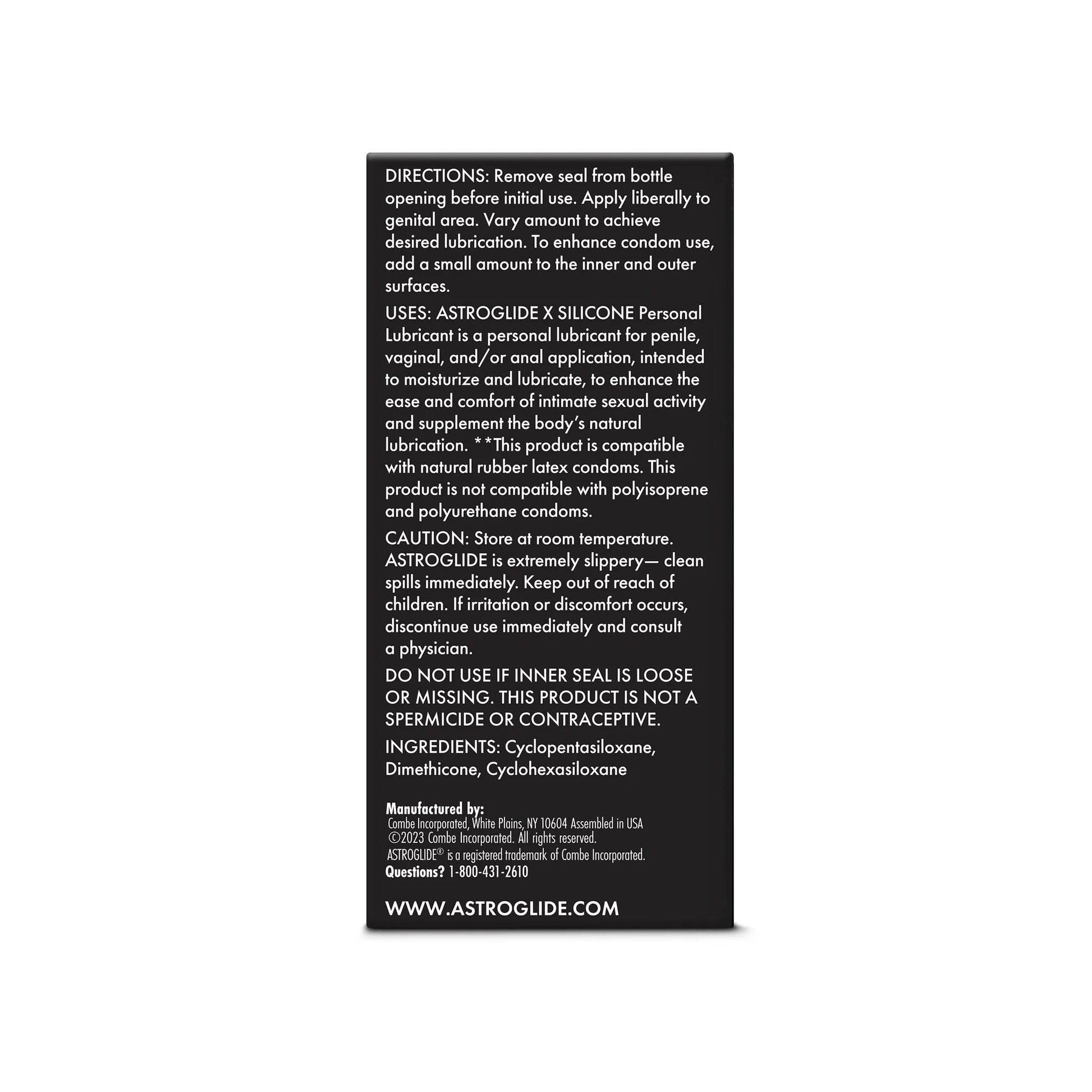 Astroglide Silicone Based Personal Lubricant 2.5 fluid ounces. Silicone Based Personal Lubricant has a silky feel that is soothing to the skin and leaves it feeling soft and smooth. Silicone is also hypoallergenic, so silicone lubes are a great choice for lube users with sensitive skin or who have experienced allergies when using another personal lubricant. And since silicone lubricant contains mostly Silicone, they often last longer and need to be reapplied less often than a water based lubricant. Ingredients: Cyclopentasiloxane, Dimethicone, Dimethyl Ether, Cyclohexasiloxane. Made in the USA.Categories: Lubricants, Silicone Based Personal Lubricant. 2024.