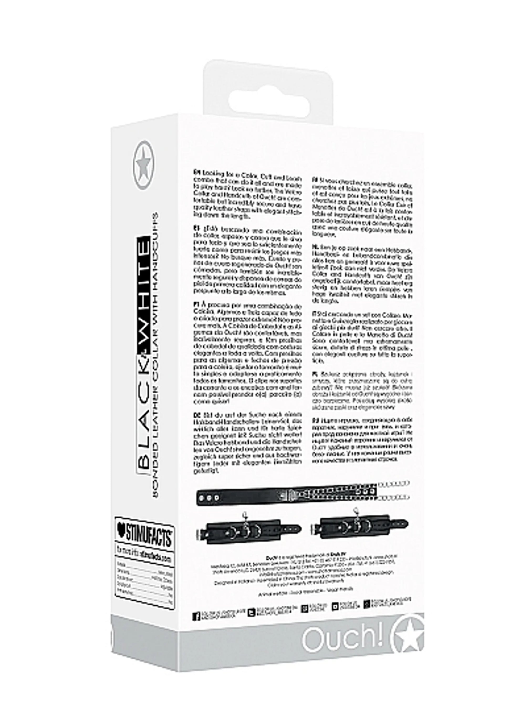 Best Fetish Brand of the Year Bonded Leather Collar With Hand Cuffs, Adjustable Straps and Chain from Shots Toys America. Looking for a Collar, Cuff and Leash combo that can do it all and are made to play hard? Look no further. The Leather Collar and Handcuffs of Ouch! are comfortable but incredibly secure and have quality leather straps with elegant stitching down the length. With straps for the cuffs and snap fasteners for the collar adjusting the size is a breeze and fits almost any size. The clip on chain holders and D-ring connectors make it possible to constraint your lover anyway you like! Specifications: dimensions package 6.69 inches by 3.54 inches by 1.97 inches. Shipping weight package 10.93 ounces. Product dimensions 27.56 inches by 5.51 inches by 2.17 inches. Product weight 10.65 ounces. Materials Leather and Metal. Categories: Bondage, Fetish, Kink, Bondage Restraints, Collars and Leashes, Bondage Kits and Kinky Sets. Primary image model wearing handcuffs. 2022._x000D_
