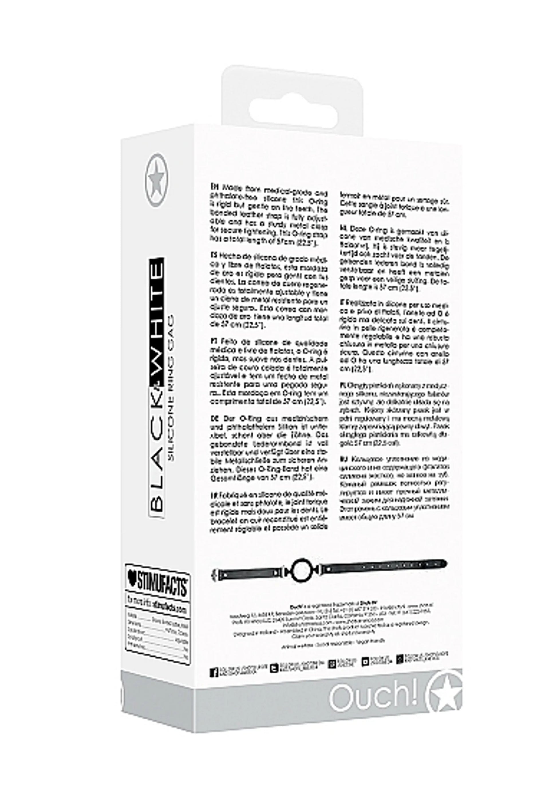 Best Fetish Brand of the Year Black and White Silicone Ring Gag with Adjustable Straps from Shots Toys America. This velvety smooth and completely adjustable Silicone O-ring gag is perfectly designed for comfortable but secure restriction. Stretch and open your sub?EUR(TM)s lips for a variety of play options with this beautifully crafted toy! Made from medical grade and phthalate free Silicone the O-ring is rigid but gentle on the teeth. The leather strap is fully adjustable and has a sturdy metal clasp for secure tightening. This O-ring strap has a total length of 22.5 inches. The inner diameter of the flexible Silicone ring measures 1.6 inches. Shots Toys - Black and White line. Categories: Bondage, Fetish, Kink, Sex Toys for Couples, Bondage Restraints, Gags and Muzzles. Primary image female model wearing gag. 2022.