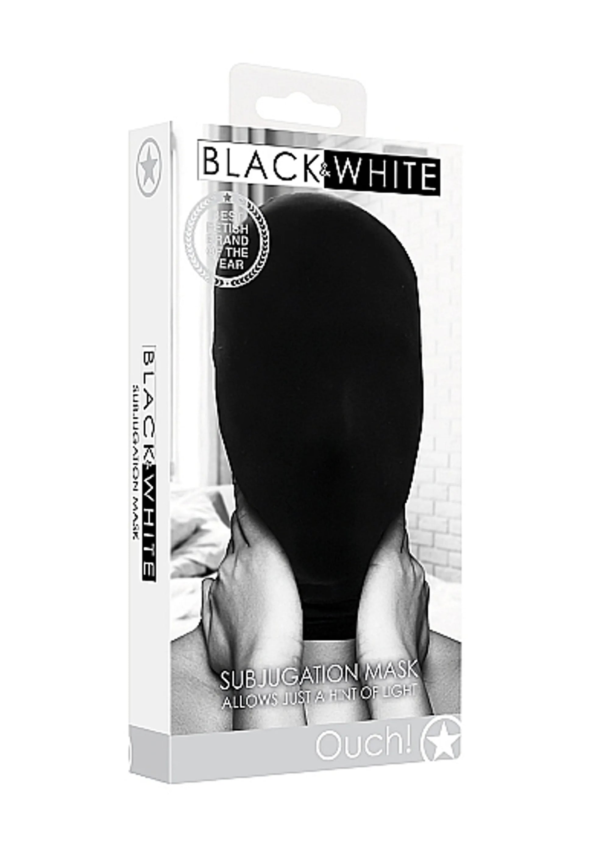 Ouch! Black and White Bondage line Black Subjugation Mask Allows Just A Hint Of Light from Shots Toys. This comfortable Subjugation mask is designed to stretch completely over the head and closes easily at the back with a zipper. The fabric allows just a hint of light in while impairing vision and awakening other senses. The shiny hood can be worn by him or her, and the thin light weight fabric makes breathing and hearing a snap. Dimensions package 6.69 inches by 3.54 inches by 0.98 inch. Weight package 2.19 ounces. Product dimensions: 15.55 inches by 7.09 inches by 0.08 inch. Product weight 1.38 ounces. Materials: Spandex. One size fits most. Categories: Bondage, Fetish, Kink, Naughty Role Play, Sex Toys for Couples, Hoods, Goggles. Shots - America. Best Fetish Brand of the year. 2022.
