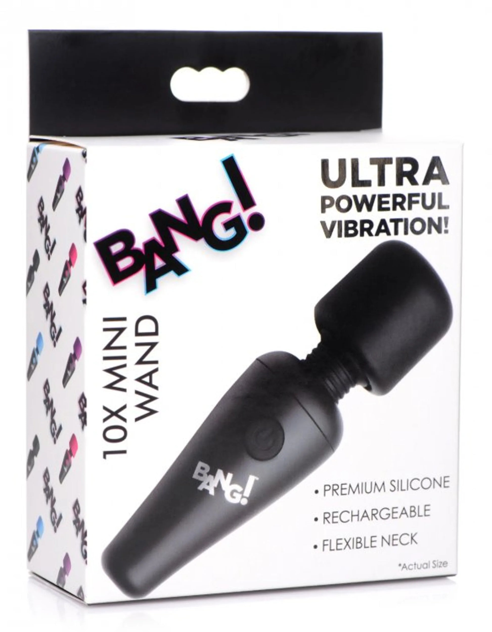 Bang! 10X Vibrating Mini Wand Black from XR Brands. The perfect travel companion! This tiny wand fits in the palm of your hand but delivers a powerful punch! Wherever you go, slip it into a travel bag, a purse, a large pocket, or tuck it away in your drawer at home! Now you can enjoy your favorite wand vibe without taking up as much space! This premium Silicone vibrating wand has a flexible neck for pressing the vibrating head into any area that feels pleasurable to relieve your tension at any time. Choose between 3 speeds and 7 patterns of vibration until you find the perfect setting. After use, simply wash with warm water and soap, and spray with a toy cleaner. Use only with a Water Based Lubricant. Measurements: overall length 4.3 inches, Head diameter 1.2 inches. Materials: Silicone head, ABS plastic handle. Color Black. Key features: travel friendly wand: This mini wand can fit in the palm of your hand making discreet travel with your favorite vibe easy! Flexible neck the neck bends enough so that the vibrating head and be pressed or moved into the angle that feels best for you. Powerful vibration: choose between 3 speeds and 7 patterns of vibration. Rechargeable vibrations and body safe: made of premium grade Silicone, this toy is USB rechargeable. Simply insert the jack pin into the dimple at the base of the charger and connect to a USB port. Categories: Rechargeable Vibrators, Palm Size Massagers, Small Palm Size Massagers, Sex Toys for Women. Video. 2023.