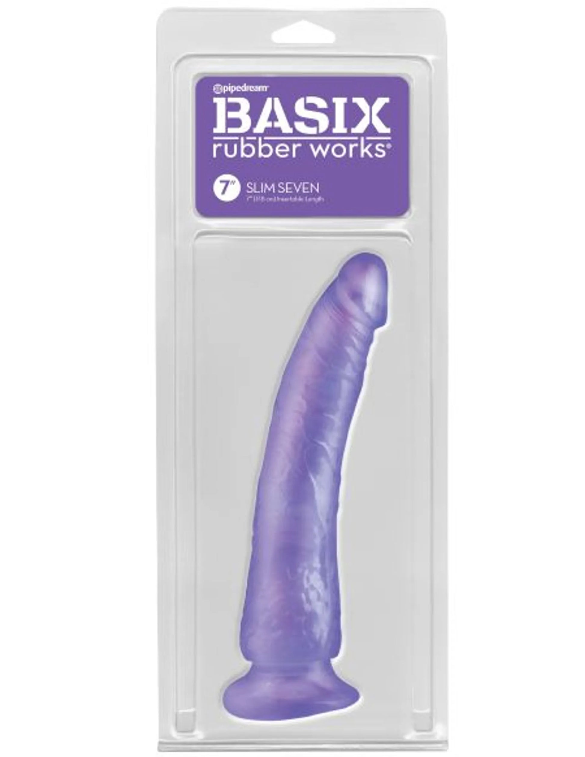 Basix Rubber Works Slim 7 inches Purple Dong with a Suction Cup from Pipedream Products. Dong is ready to fulfill your wildest bedroom fantasies on command! This moderately wide toy is the perfect size for both vaginal and anal satisfaction, and a wide harness compatible suction cup base makes a great handle. Try it on the floor of the bathtub or the wall of the shower for getting down and dirty while you get clean! Mexico made rubber is 100% phthalates and latex free, environmentally safe and hypoallergenic. Pipedream hopes you enjoy using this product as much as they like making it! Colors may vary. Item dimensions: length 7 inches, width 1.75 inches, height 1.5 inches, girth 5.5 inches, diameter 1.75 inches. Insertion length 6.5 inches. Bulk weight 8.10 ounces. Package depth 2.5 inches, width 5.25 inches, height 13.5 inches. Package shippings weight 10.25 ounces. Features and functions: phthalates free, unisex, Suction Cup Base. Materials PVC. Country of Origin Mexico. Harmonized Tariff Schedule HTS Code 4016996000. Basix Rubber Works 7 inches Slim Dong - Pipedream Products Catalogs - Spring Made Fresh Daily Basix. Categories: Anal Toys, Probes, Sticks, Rods, Dildos, Dongs, G-Spot. 2022.