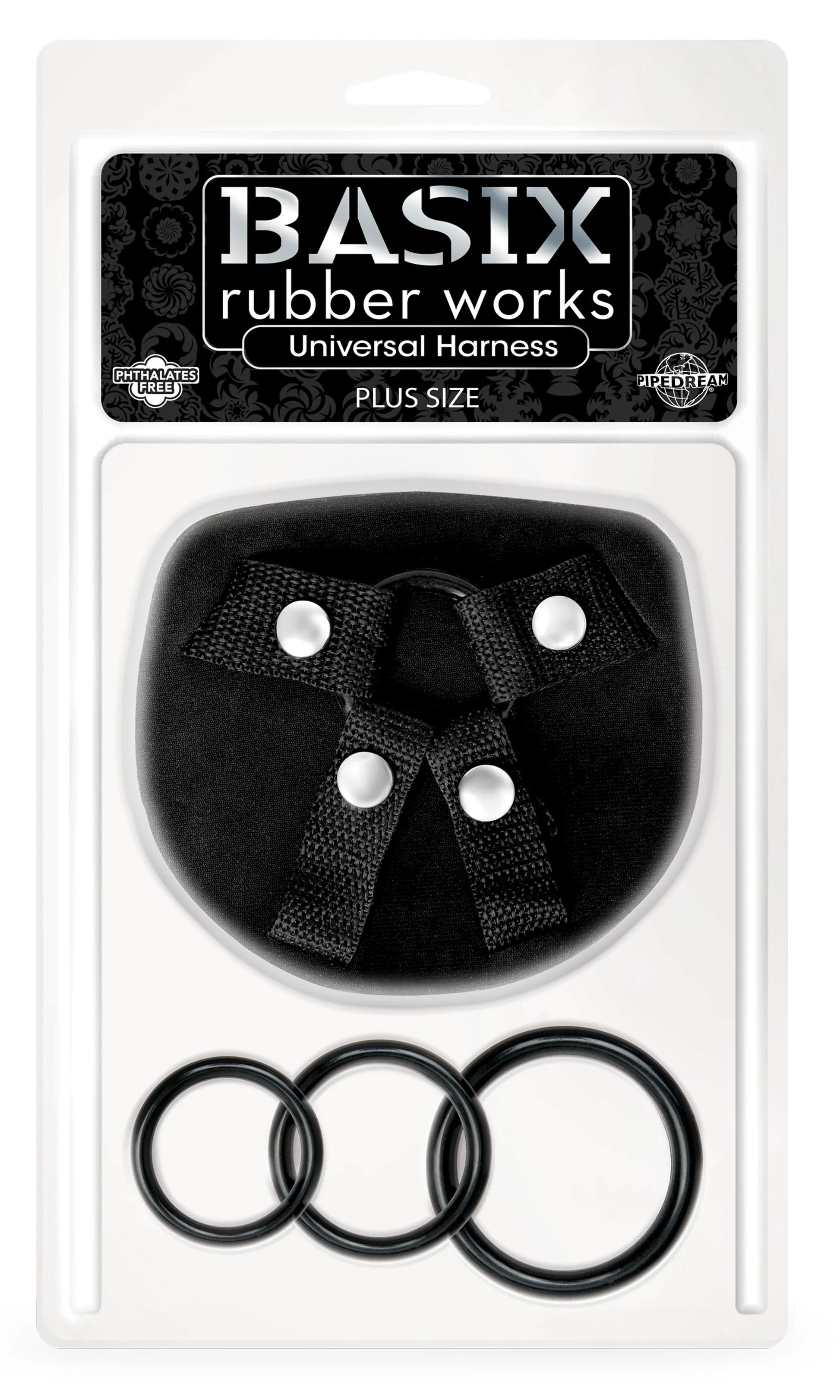 Basix Rubber Works Universal Harness Plus Size from Pipedream Products. The Basix Universal Harness is available in Regular and Plus Size and includes 3 Silicone rings. Each sold separately. Easy to adjust and fun to use for sexy strap on play. Most of the Basix dildos are Strap On ready and Harness Compatible. Includes small 1.2 inches, Medium 1.6 inches and Large 2 inches. Silicone rings. Materials: PVC. Package depth 1.5 inches, width 8 inches, height 14 inches. Package shipping weight 7.20 ounces. Country of origin China. Basix Universal Harness is Pipedream Products - Catalogs - Spring Made Fresh Daily Basix Rubber Works - Basix Rubber Works page 6. Shown with dildo. Dildo not included. Sold separately. Categories: Bondage, Fetish, Kink, Sex Toys for Couples, Strap Ons, Harnesses, Plus Size, Sex Toys for Women. 2022.