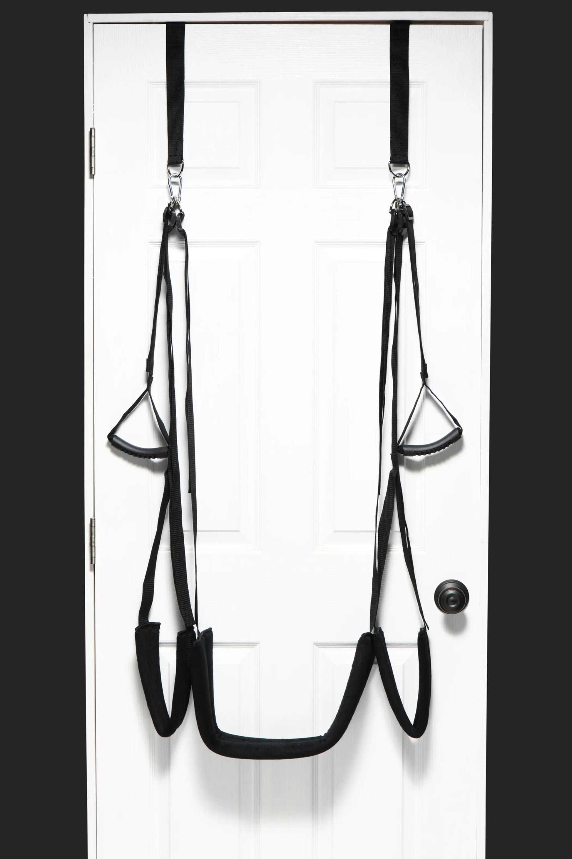 Bedroom Bliss Signature Collection Lover's Door Swing from XR Brands. Elevate your pleasure with this Lover's Door Swing! This sex sling hangs over a closed door from nylon straps and stays in place via the ABS Plastic cylinders that protect the door from scuffing and scratches. The strong, durable Nylon is padded with Polyester cushions that support the thighs and bottom. Two handles hang from the door frame as well so you can pull up to adjust your position and feel more secure. The sex swing can support up to 300 pounds! Seat pads, leg pads and hand rips are all adjustable. The straps are easy to hook over a door or clip to Sex Swing Stand. Spot clean as needed or machine wash the straps and pads. All materials are phthalate free and Nickel free. With the Swing in place over the door, your partner helps lift you into place. You tug at the straps to adjust them for the perfect angle, your hips lifted and legs spread wide. They start by making their way from your lips to between your thighs and kneel on a pillow as they lick you. Once you are dripping wet, they come up for air and kiss you deeply again. They pull your hips towards them and carefully slide themselves inside. You gasp in pleasure! The angle is perfect and hits that hard to reach spot! They rock their hips, thrusting back and forth, until you are screaming so loud the neighbors hear! Finally your whole body convulses and a waterfall gushes out of you. Your partner laughs, grabs a towel, and comes back for more! Measurements: Door mount straps 13 inches length. Leg pads 3 inches by 17.5 inches. Seat pad 5 inches by 26.5 inches. Weight Capacity holds up to 300 pounds. Materials: Polyester, Nylon, ABS Plastic, Metal, Silicone. Color Black. Note: test the sturdiness of the door and door frame before engaging in activity. Key features: easy to set up. Easily hook it over a door frame or clip it into a sex swing stand. Adjustable straps. The seat pads, thighs pads and hand grips are all adjustable for a custom, comfortable position. Strong and durable. This durable Nylon can handle up to 300 pounds of weight so you can feel safe and secure while suspended. Padded for comfort. The straps are padded around the seat area and thighs so you can relax and enjoy the ride without Nylon biting into your skin! Categories Bedroom Bliss: Bondage, Fetish, Kink, Sex Swings, Machines, Erotic Furniture, Sex Toys for Couples. 2023.