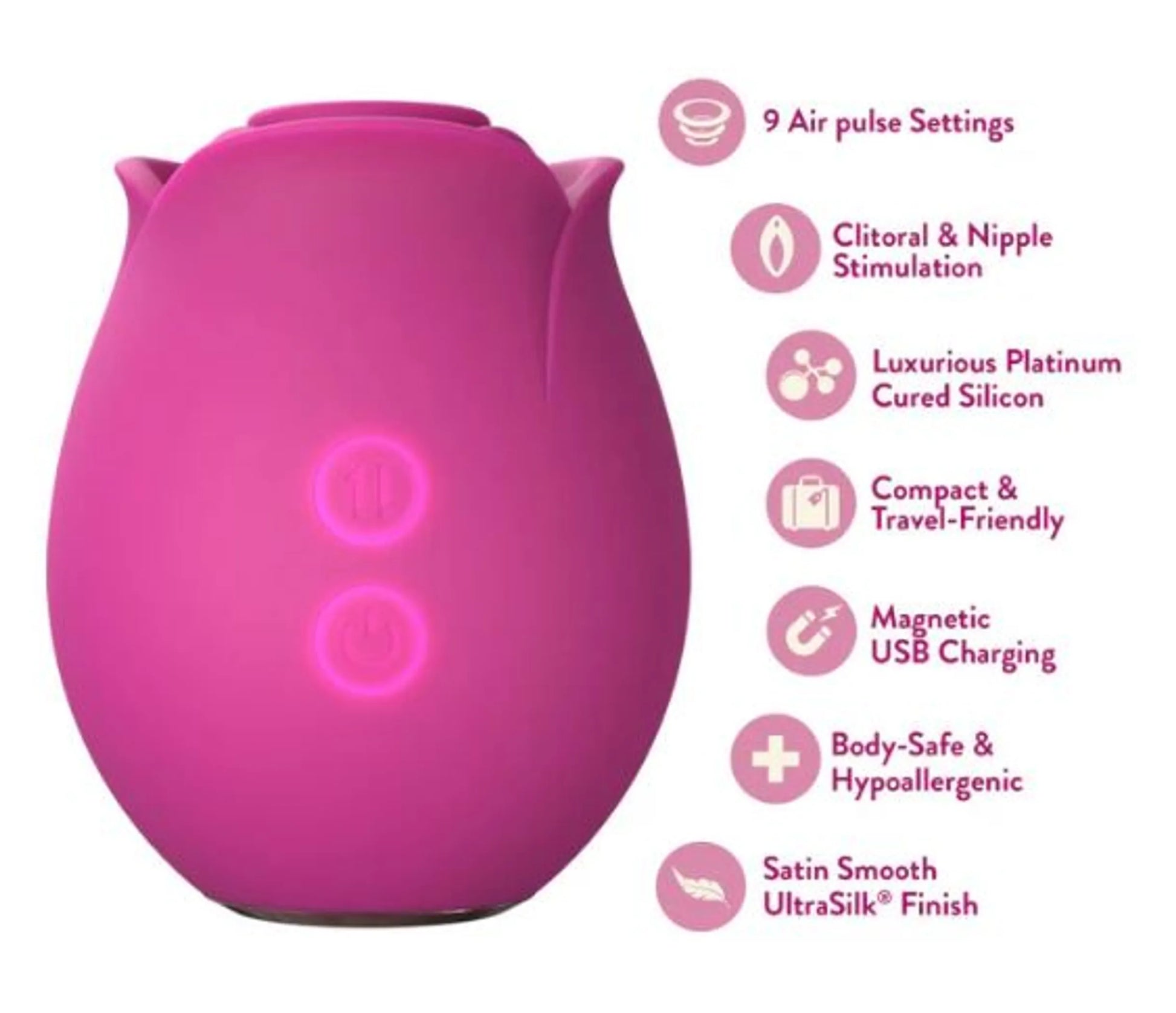 Experience the elegance and luxury of The Original Blush Rose to elevate your intimate play. Fitting comfortably in the palm of your hand, this rose-inspired massager features powerful Air Wave suction technology, offering a delightful array of 9 settings, with 6 speeds, and 3 unique patterns for soft, sensual stimulation from its petal-shaped tips. Crafted from 100% body-safe platinum-cured silicone with an UltraSilk?,?(R) satin-smooth finish, The Rose is not only stunning to behold but also a pleasure to touch. Its compact, travel-friendly design, paired with magnetic USB charging, ensures it's always ready to fulfill your desires. Perfect for both solo and partnered use, The Rose is easy to clean, non-porous, and splashproof, inviting you to explore freely. Unveil your passionate desires and bring elegance and delight to every intimate experience.