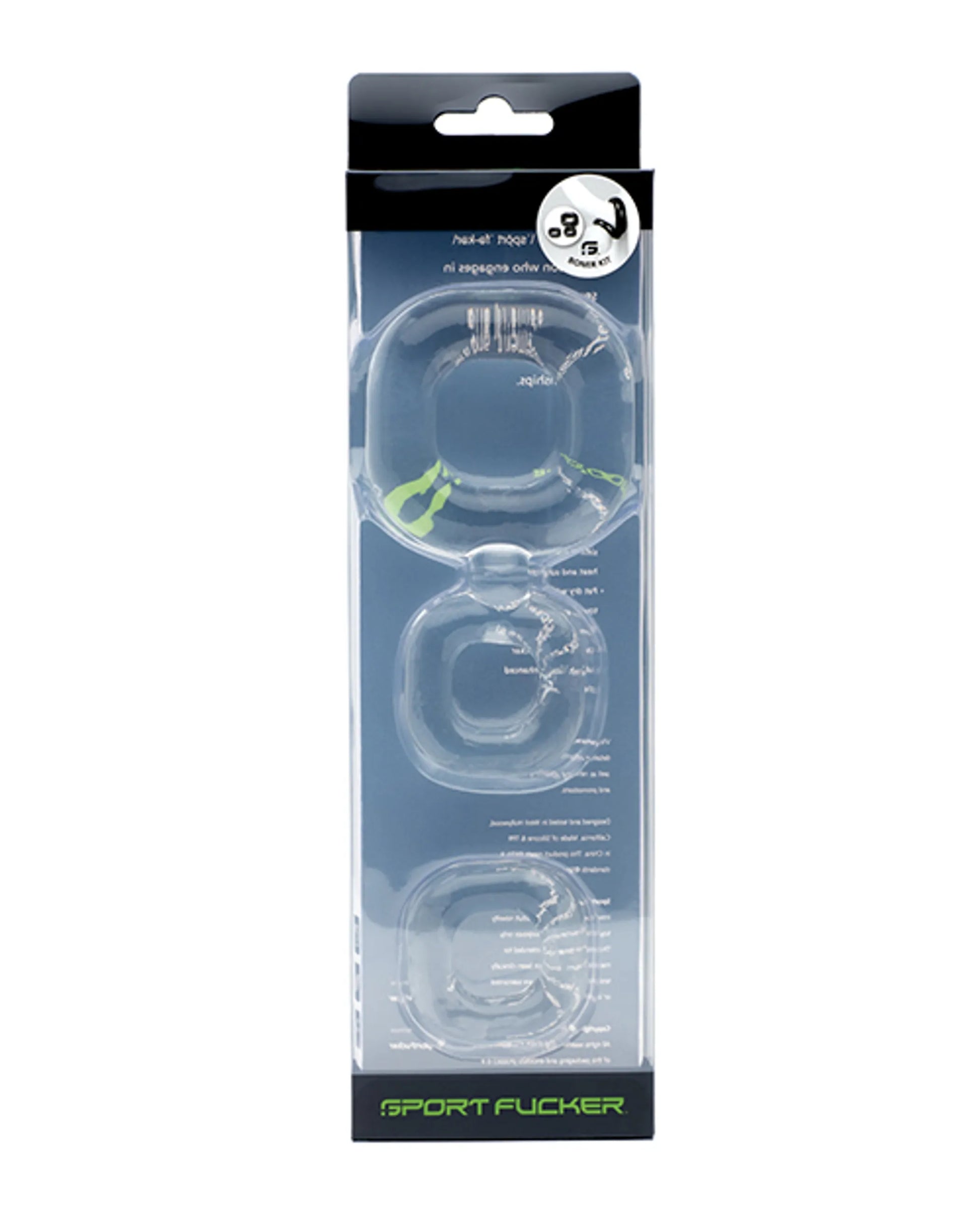 Boner Kit Clear from Sport Fuckers. Check out this revolutionary design in six hot colors. Sport Fucker has done it again. This is not merely a cock ring. It is a complete Boner Kit! The stretchable Thermoplastic Rubber TPR allows both square rings to stretch over your junk and firmly hold it in place. Each kit comes with one square cock ring with an attached ball stretcher plus an additional loose ball stretcher. Add one or more of our expansion packs and stretch those balls even further. No need to buy the same color, combine different colors for a great sporty look. Dare to free ball in your jeans with our Boner Kit. The more ball spacers you add, the more friction and sensation you will be feeling. Add our expansion pack and throw on some raw denim as you are free balling. You are sure to bust a nut just walking around your local bar from the friction alone! Features and dimensions: comes in 6 hot colors ?EUR" Black, Clear, Red, Metal, White and Ice Blue. Super stretchable yet firm body safe materials Thermoplastic Rubber TPR. Cock Ring Exterior: 2.5 inches by 2.5 inches. Cock Ring Interior: 1.7 inches by 1.7 inches. Ball Ring Exterior: 1.3 inches by 1.3 inches. Ball Ring Interior: .9 inch by .9 inch. Information on the back of the packages: Sport Fuck-er adjective: a person who engages in sexual activities purely for his own amusement and is not interested in a long term relationship. Product care: wash before and after use. Store separately from other similar materials. Store away from heat and sunlight. Pat dry with a soft cotton towel and allow to dry completely before storing. Use with Sport Fucker lubricants for a more enhanced pleasure session. Categories: Bondage, Fetish, Kink, Sex Toys for Couples, Sex Toys for Men, Sensual Kits, Men's Cock and Ball Gear, Cock Ring Trios. 2023.