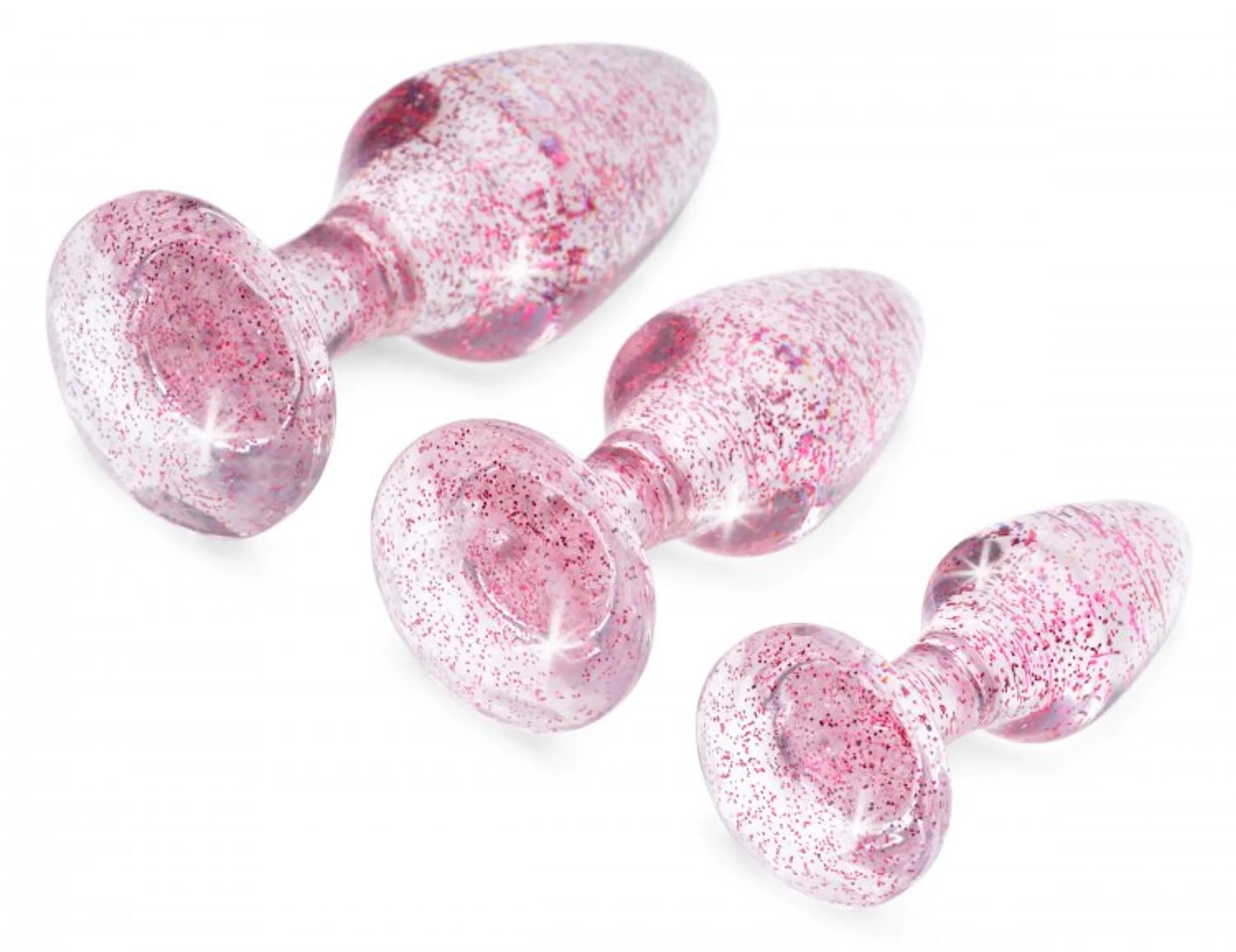 Booty Sparks Glitter Gem Anal Plug Set Pink from XR Brands. This set of smooth, solid, Butt Plugs feature a shiny glittery pattern to decorate your booty while you play! These Glitter Gem plugs are tapered, slim, and graduate in size from small to large for easy training perfect for beginners and experts alike! Start off easy with the smallest size and get your back door familiar with this new sensation. The tapered tip and slender body make the smallest size the best way to introduce yourself to the world of anal play without any discomfort! Up grade to Medium Anal Plug and Large Anal Plug when you think you can take it, at your own pace. Expert anal players will appreciate the ease of which to warm up their ass for further fun with this Glittery set of Anal Plugs! Choose the size that matches your comfort level and surprise your lover when you pull your pants down with this dazzling Anal Plug Gem! Small Butt Plug measurements overall length 3.2 inches, insertion length 2.6 inches, diameter at widest point 1.1 inches. Medium Butt Plug measurements overall length 3.7 inches, insertion length 3 inches, diameter at widest point 1.3 inches. Large Butt Plug measurements overall length 4.4 inches, insertion length 3.7 inches, diameter at widest point 1.5 inches. Materials Acrylic. Color Pink. Categories: Anal Toys, Sex Toys for Couples, Sensual Kits, Anal Trainer Kits. 2023._x000D_