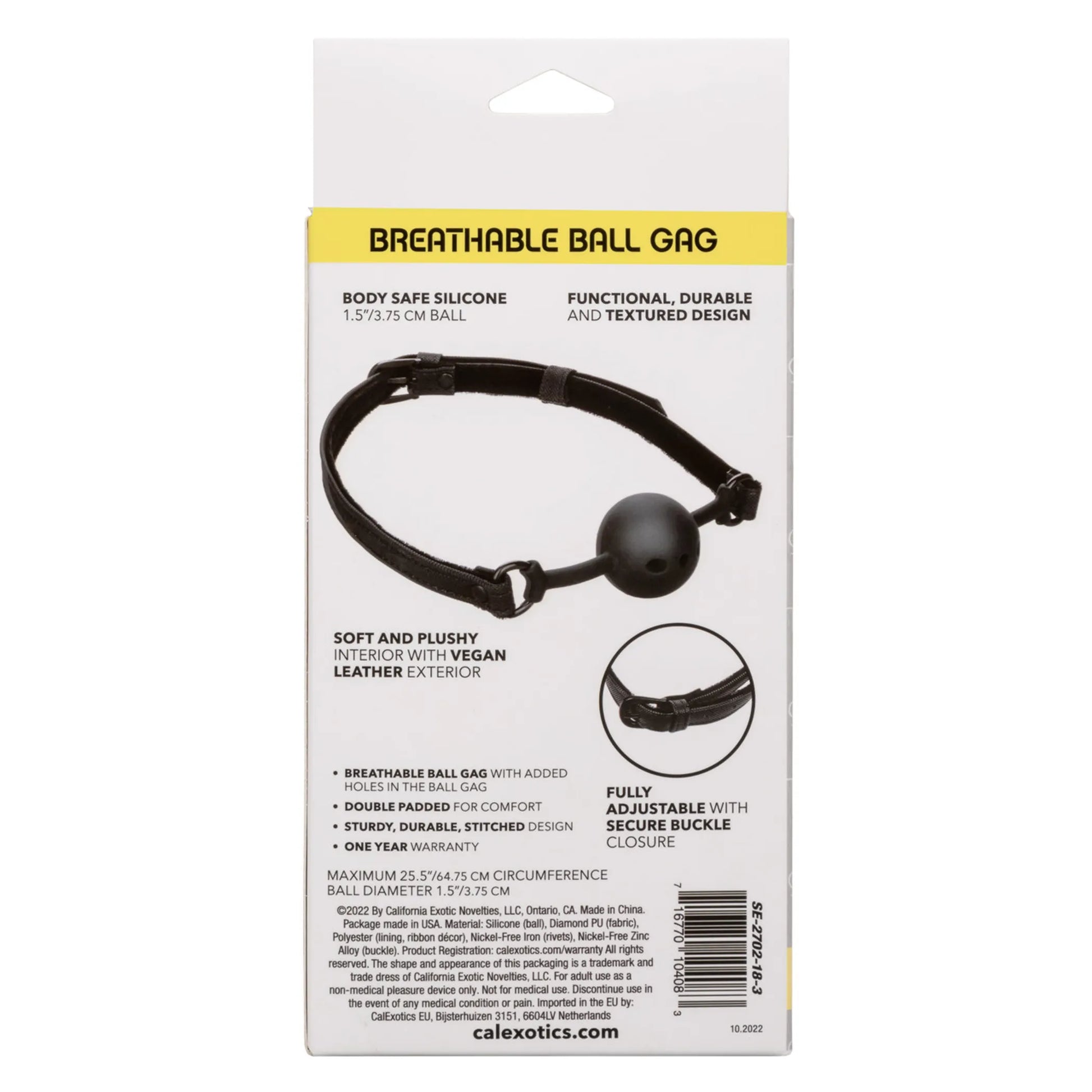 Boundless Breathable Gag from California Exotic Novelties. The Boundless Breathable Ball Gag is the perfect erotic accessory for couples looking to experiment with erotic restraint play or fierce fetishists looking to indulge their deepest desires. Surrender to your naughtiest fantasies as you secure the pliable Silicone ball gag, designer vegan leather straps, and adjustable buckle closure. The pliable breathable ball delivers primal passion to your bedroom, while each muffled moan enhances pleasure and intensifies arousal for everyone involved. Dive deep into adventurous desire and indulge in your most erotic fantasies with this sensationally comfortable breathable ball gag. Specifications: SKU SE-2702-18-3. Color Black. 1 year warranty. Material type Silicone. Features: Phthalate free. Measurements: 25.5 inches maximum circumference. 1.5 inches ball diameter. Bulk weight 2.8 ounces. Package 3.9 ounces. Package: 2.1 inches by 4 inches by 8.5 inches. Categories: Bondage, Fetish, Kink, Sex Toys for Couples, Bondage Restraints, Gags, Muzzles. 2023._x000D_