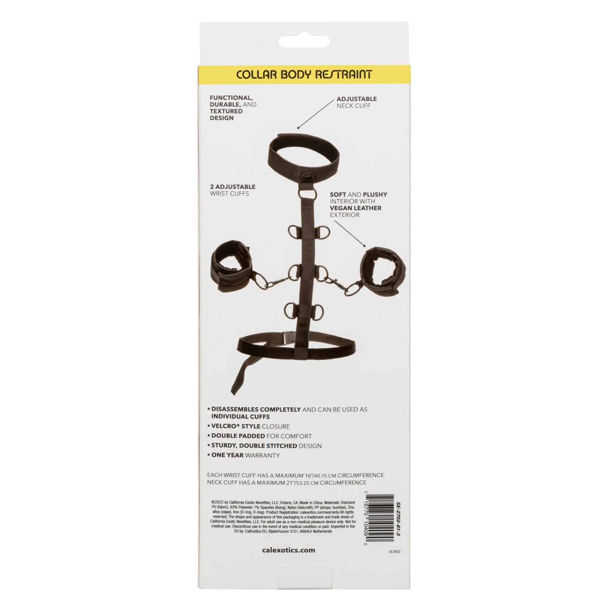 Boundless Collar Restraint from California Exotic Novelties. Push the boundaries of pleasure and embrace endless bondage possibilities with the Cal Exotics Boundless Collar Body Restraint. Slip into this daring restraint system and explore passionate play in the vegan leather universal cuffs, heavy duty collar, and multi-level restraint tether. Fetishists and bashful beginners alike can indulge in passionate pleasure play by slipping into the wickedly sexy restraints and padded faux leather cuffs. Once you have wrapped this beautifully sinful collar around your neck, your dominant will delight in using the multi-levels of restraints to command and control your pleasure. The plush vegan leather cuffs are equipped with a heavy duty universal clasp with a swivel design to give your pleasure full range of motion. Plus, the detachable cuffs can be used independently for more adventures. Even the newest to submissive play will love the thrilling comfort of the plush inner layer of the collar and the cuff?EUR(TM)s double padded, double stitched design. Bring your most erotic dreams to life and dive deep into your most adventurous desires with this sensationally comfortable collar body restraint. Specifications: SKU SE-2702-81-3. Color Black. 1 year warranty. Material type: Hard. Features: Phthalate free. Measurements: 21 inches collar circumference. 16 inches cuff circumference. Bulk weight 8.5 ounces. Package 10.5 ounces. _x000D_