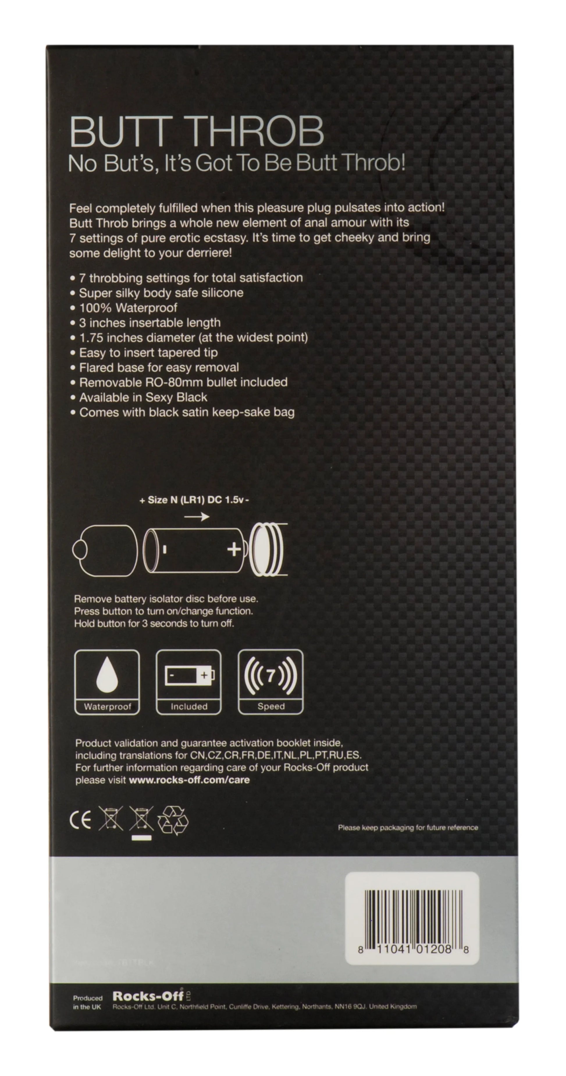 Butt Throb Black Vibrating anal sex toy, prostate stimulator is powered by the world famous Rocks Off RO-80mm with 7 speeds of vibration. Easy to insert tapered tip with flared base for easy removal. Butt Throb no buts, it is got to be Butt Throb! Feel completely fulfilled when this pleasure plug pulsates into action! Butt Throb brings a whole new element of anal amour with its 7 settings of pure erotic ecstasy. It is time to get cheeky and bring some delight to your derriere! Vibrating bullet is the original RO-80mm ammo style bullet from Rocks-Off. Can be used it without sleeve too. It is still the most powerful bullet in the world. With one touch operation and powerfully intense vibes, this discreet little pleasure bullet will have you weak at the knees. Size: vibrator sleeve 95mm x 35mm x 35mm. RO-80 measures 80mm x 16mm. Battery Type: 1.5 Volt N size / LR1. Battery Quantity: 1. Color: Black. Waterproof: Yes. Speed: 7. Details: Materials: Body Safe Silicone.7 throbbing settings for total satisfaction. 100% waterproof with battery included. 3 inches insert-able length and 1.75 inches diameter. + Size N Battery Plus side goes toward the bullet. Diagram found on the back of product shows proper placement. How to use: instructions included in 12 languages. Remove the isolator disc before use. Press button on the end to turn on and change functions. Hold button for 3 seconds to turn off. Waterproof. Battery included. 7 Speed. Product validation and guaranteed booklet inside including translations for CN, CZ, CR, DE, FR, IT, NL, PL, RU, ES. Please keep packaging for further reference. Categories: Anal Toys, Prostate Massagers, P-Spot Stimulators, Vibrators, Straight Vibrators with Sleeves. 2024.
