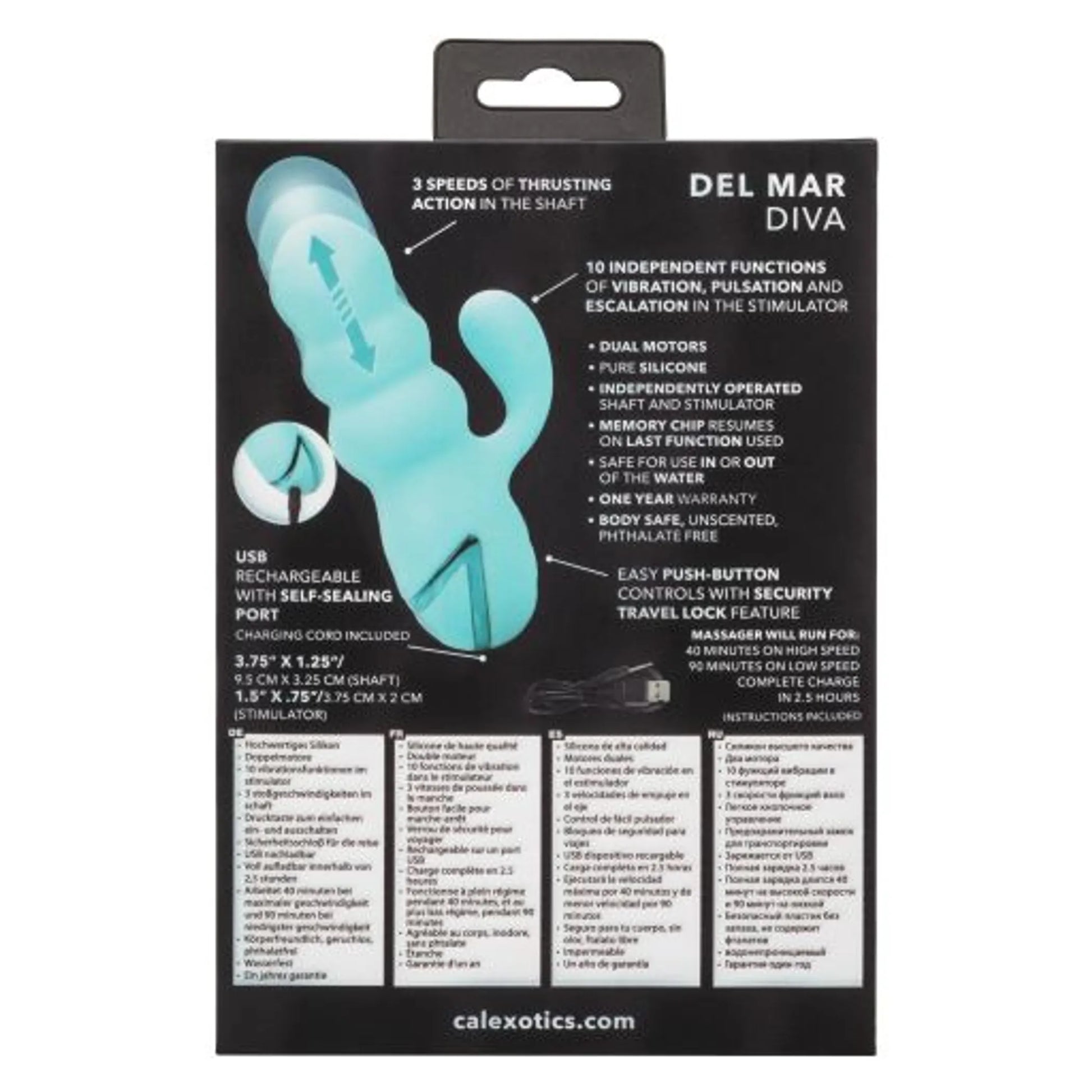 California Dreaming Del Mar Diva Green Vibrator from California Exotic Novelties. The playful California Dreaming Collection brings luxurious fantasies to life with the daring Del Mar Diva. The powerful massager is ready to relive your favorite summer fling fantasies with 10 powerful functions of vibration and 3 knee shaking thrusting speeds. While the flickering stimulator teases, the bulbous shaft and rounded tip deliver a deep thrusting stimulation. The shaft has a powerful thrusting action to make sure you always hit the right spot. The rumbling tickler uses a powerful vibration motor to deliver blissful external stimulation. The flexible teaser can be used independently from the thrust function for fully customizable pleasure. The knee shaking gyrations packed into this playful vibe are not for the faint of heart! Dual power motors put out deep rumbling vibrations and powerful thrusting. Plug the provided USB cable into the self sealing charging port to recharge your passion in 2.5 hours. Thrill with up to 90 minutes of intense pleasure. To effortlessly control stimulation, the sleek 3 button control pad lets you independently operate the vibration and thrusting options. The high tech memory chip remembers just how you like it and resumes play on the last function used. Specifications: SKU SE-4349-30-3. Color:Blue. Power source: USB. 1 Year Warranty. Material type: Silicone. Features: Phthalate Free, Waterproof Vibrations, Rechargeable power, Vibrates. Measurements: 3.75 inches by 1.25 inches shaft. 1.5 inches by 0.75 inches clitoral stimulator. Bulk weight 5 ounces. Package: 10 ounces. Package with Vibrator 2.6 inches by 5.4 inches by 8.4 inches. Categories: Vibrators, Rabbit Style Vibrators, Eco-Friendly Sex Toys, Rechargeable Vibrators, Sex Toys for Women, G-Spot Rabbit Style Vibrator. 2023.
