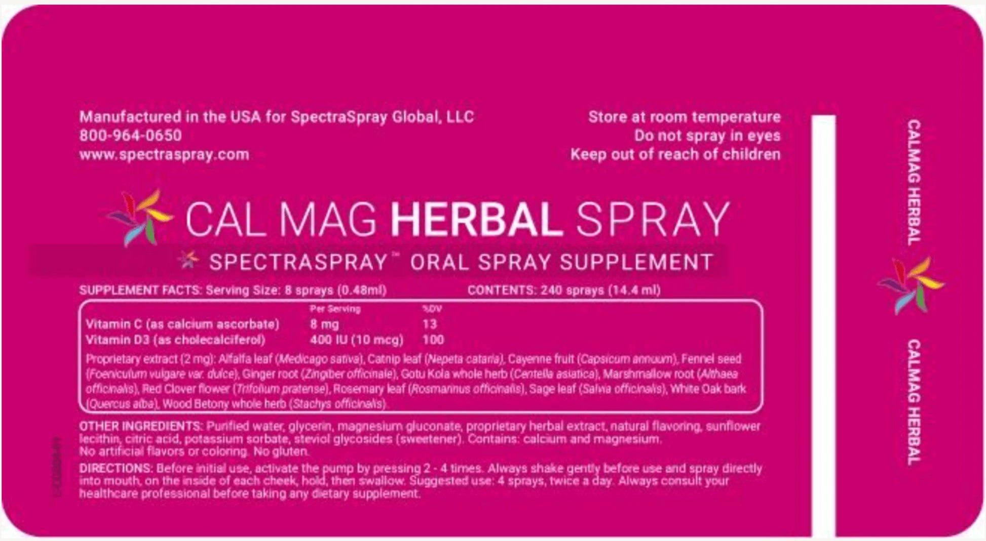 SpectraSpray's CALMag Herbal by SpectraSpray is a balanced herbal supplement with added Calcium & Magnesium. Natural mineral sources from more than 12 herbs have been used throughout history to support numerous health concerns. In addition, it provides 100% of the RDA of Vitamin D3, working synergestically with the unique herbal blend for added absorption and to help support the maintenance of mineral balance within your body. Superior oral absorption provides effective results. Directions: Before initial use, activate pump by pressing a few times. Always shake gently before use and spray twice inside each cheek, twice a day; 8 sprays per day (suggested use: 4 sprays, twice a day, or you can wait a few seconds and repeat 4 sprays immediately for a full dose)