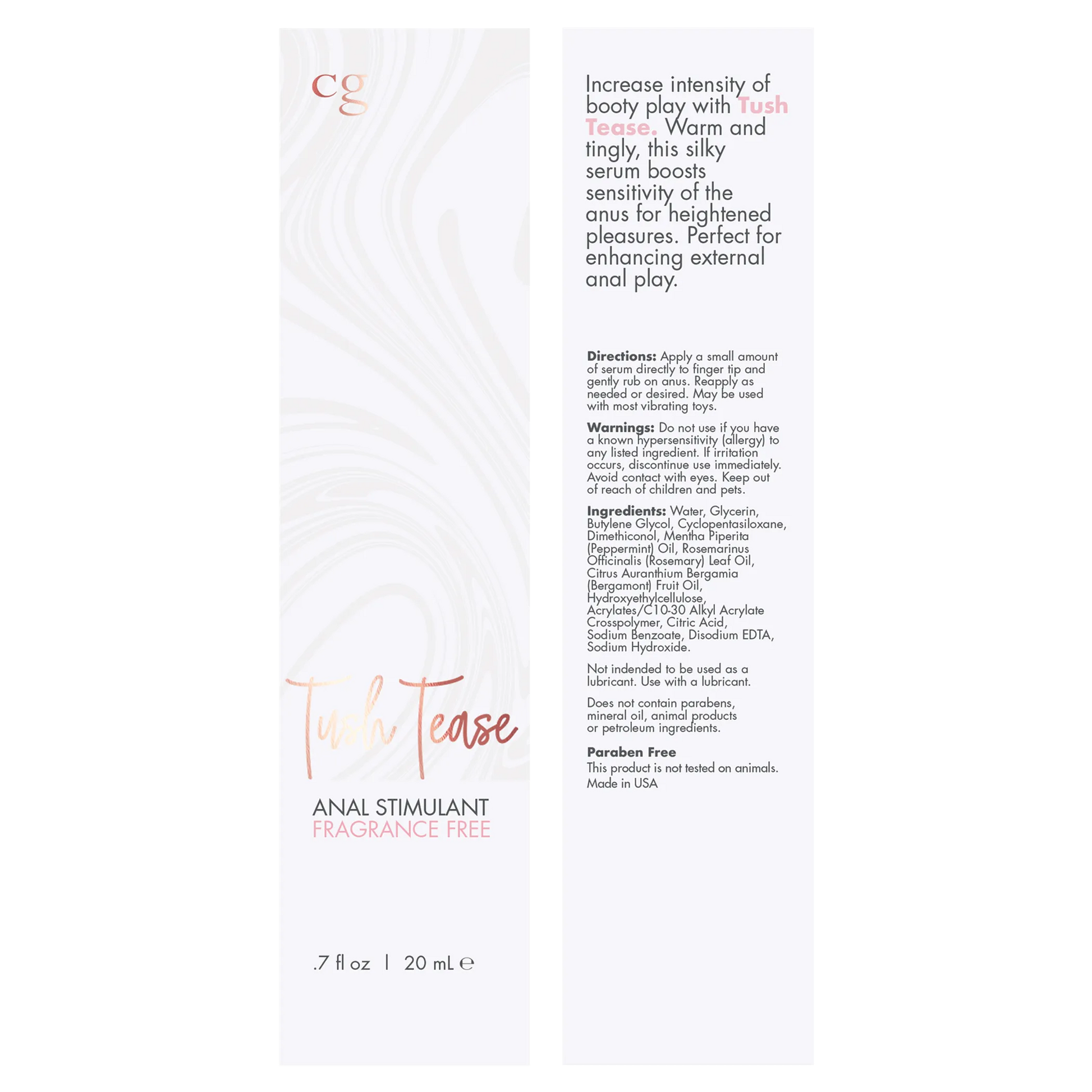 CGC Tush Tease Anal Stimulant Au Naturel .7 fluid ounce from Classic Erotica. Increase intensity of booty play with Tush Tease. Warm and tingly, this silky serum boosts sensitivity of the anus for heightened pleasures. Perfect for enhancing external anal play. How to use: apply a small amount of serum directly to finger tip and gently rub on anus. Reapply as needed or desired. May be used with most vibrating toys. Warnings: do not use if you have a known hypersensitivity allergy to any listed ingredient. If irritation occurs, discontinue use immediately. Avoid contact with eyes. Keep out of reach of children and pets. Warming and tingly serum, ideal for enhancing anal play. Formulated to boost sensitivity and heighten pleasure. Fragrance free. Ideal for adult toy, self and couple's play. This product does not contain Benzocaine. This product does not contain parabens or mineral oil. This product is not tested on animals. Ingredients: Water, Glycerin, Butylene Glycol, Cyclopentasiloxane, Dimethiconol, Mentha Piperita Peppermint Oil, Rosemarinus Officinalis Rosemary Leaf Oil, Citrus Auranthium Bergamia Bergamont Fruit Oil, Hydroxyethylcellulose, Acrylates/C10-30 Alkyl Acrylate Crosspolymer, Citric Acid, Sodium Benzoate, Disodium EDTA, Sodium Hydroxide. Categories: Lubricants, Warming Lubricants, Tingling Lubricant, Anal Lubes, Anal Lotions, Lubes Sprays, Creams, Natural. Made in the USA. Restricted, Amazon Restricted. 2023.