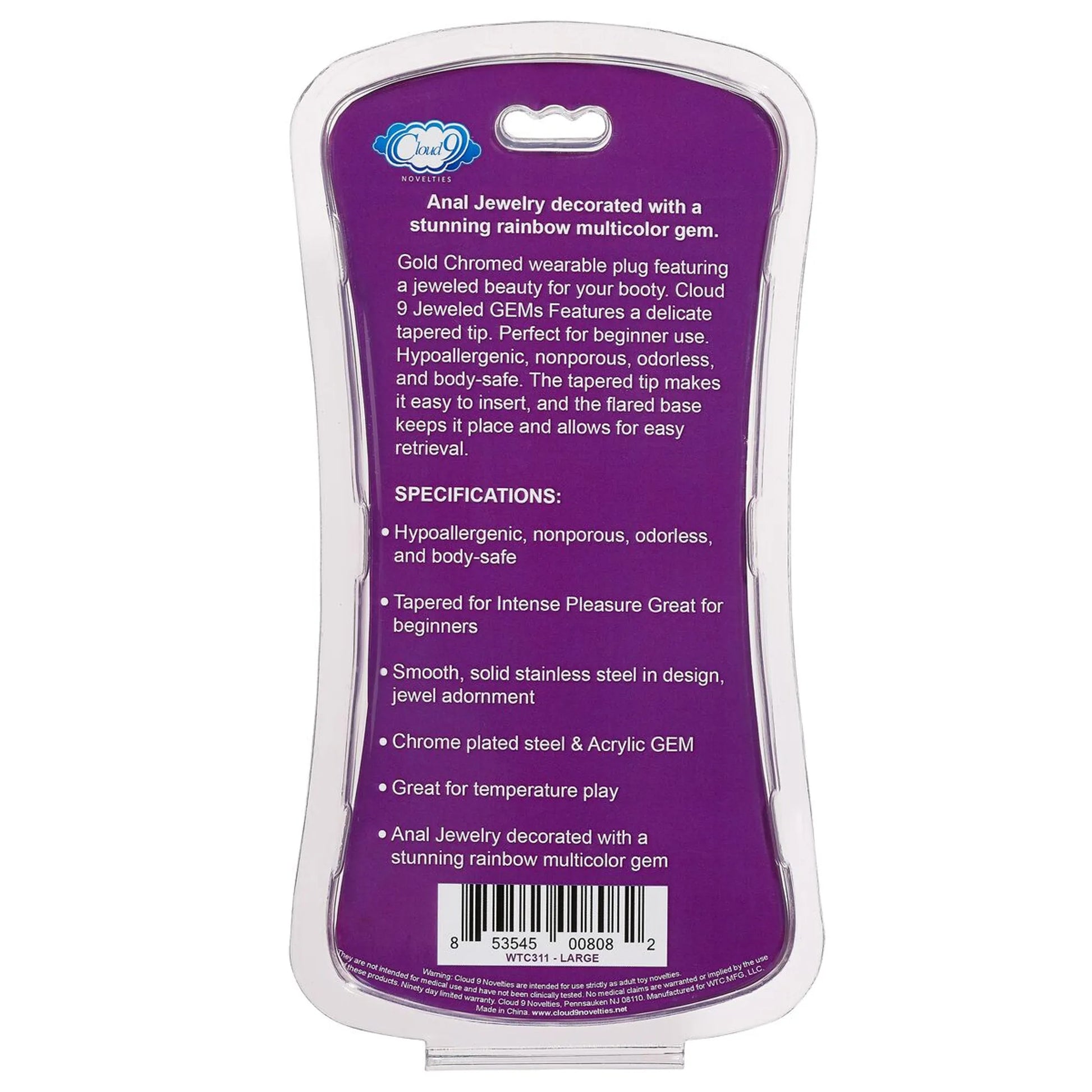 Cloud 9 Gems Gold Anal Plug Large. Anal Jewelry decorated with a stunning rainbow multicolor gem. Gold Chromed wearable stainless steel plug featuring a jeweled beauty for your booty. Cloud 9 Jeweled Gems Features a delicate tapered tip. Perfect for beginner use. The tapered tip makes it easy to insert, and the flared base keeps it place and allows for easy retrieval. The sparkling jewel makes playtime fun. This Cloud 9 Jeweled Anal Plug is excellent for temperature play when you prepare it in hot or cold water. This Cloud 9 Gem anal plug is both visually stunning and ideal for stimulating anal play. Compatible with both silicone and water based lubricants. Clean with mild soap and warm water after use. Easy to clean. Top rack dishwasher safe. Hypoallergenic, nonporous, odorless, and body safe. Tapered for intense pleasure great for beginners. Smooth, solid stainless steel in design, jewel adornment. Materials Chrome Plated Stainless Steel butt plug, Acrylic Gem. Great for temperature play. Anal Jewelry decorated with a stunning rainbow multicolor gem. Weight .36 pound. Height 3.75 inches, diameter 1.65 inches. Video. Categories: Anal Toys, Sex Toys for Couples, Large Butt Plugs. Amazon Restricted. 2023.