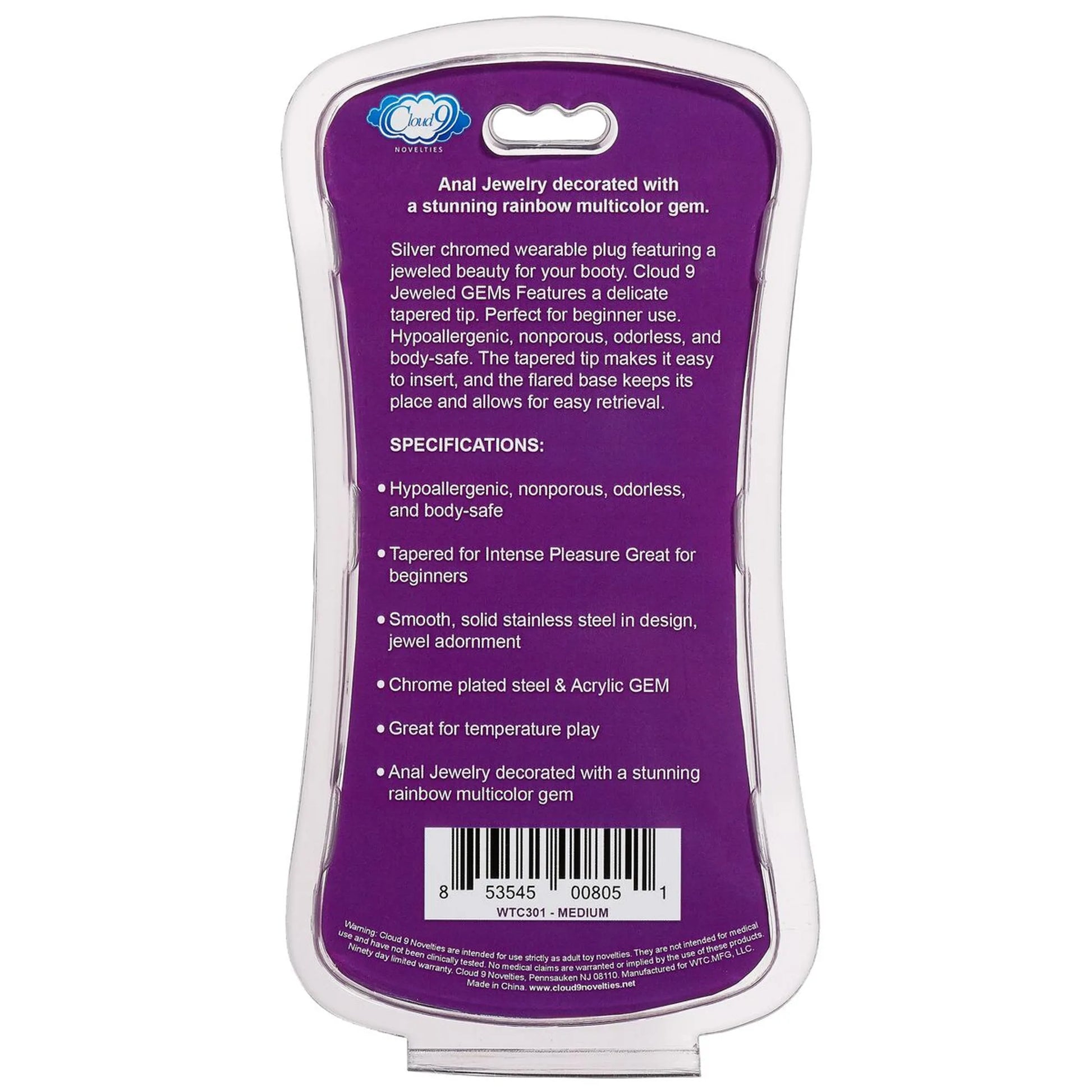 Cloud 9 Gems Silver Chromed Anal Plug Medium. Cloud 9 Novelties Anal Gems Jeweled Silver Chromed Anal Plug. Anal Jewelry decorated with a stunning rainbow multicolor gem. Silver chromed wearable stainless steel butt plug featuring a jeweled beauty for your booty. Cloud 9 Jeweled Gems. Features a delicate tapered tip. Perfect for beginner use. Hypoallergenic, nonporous, odorless, and body safe. The tapered tip makes it easy to insert, and the flared base keeps its place and allows for easy retrieval. The sparkling jewel makes playtime fun. This Cloud 9 Jeweled Anal Plug is excellent for temperature play when you prepare it in hot or cold water. This Cloud 9 Gem anal plug is both visually stunning and ideal for stimulating anal play. Compatible with water based lubricants. Clean with mild soap and warm water after use. Easy to clean.Top rack dishwasher safe. Hypoallergenic, nonporous, odorless, and body safe. Tapered for intense pleasure great for beginners. Smooth, solid stainless steel in design, jewel adornment. Chrome Plated Stainless Steel butt plug, Acrylic Gem. Great for temperature play. Anal Jewelry decorated with a stunning rainbow multicolor gem. Body safe Stainless Steel and Acrylic Gem. Great for temperature play. Weight .19 pound. Height 3.24 inches, diameter 1.36 inches. Video. Categories: Anal Toys, Small Butt Plugs, Medium Butt Plugs. Video. Amazon Restricted. 2023.
