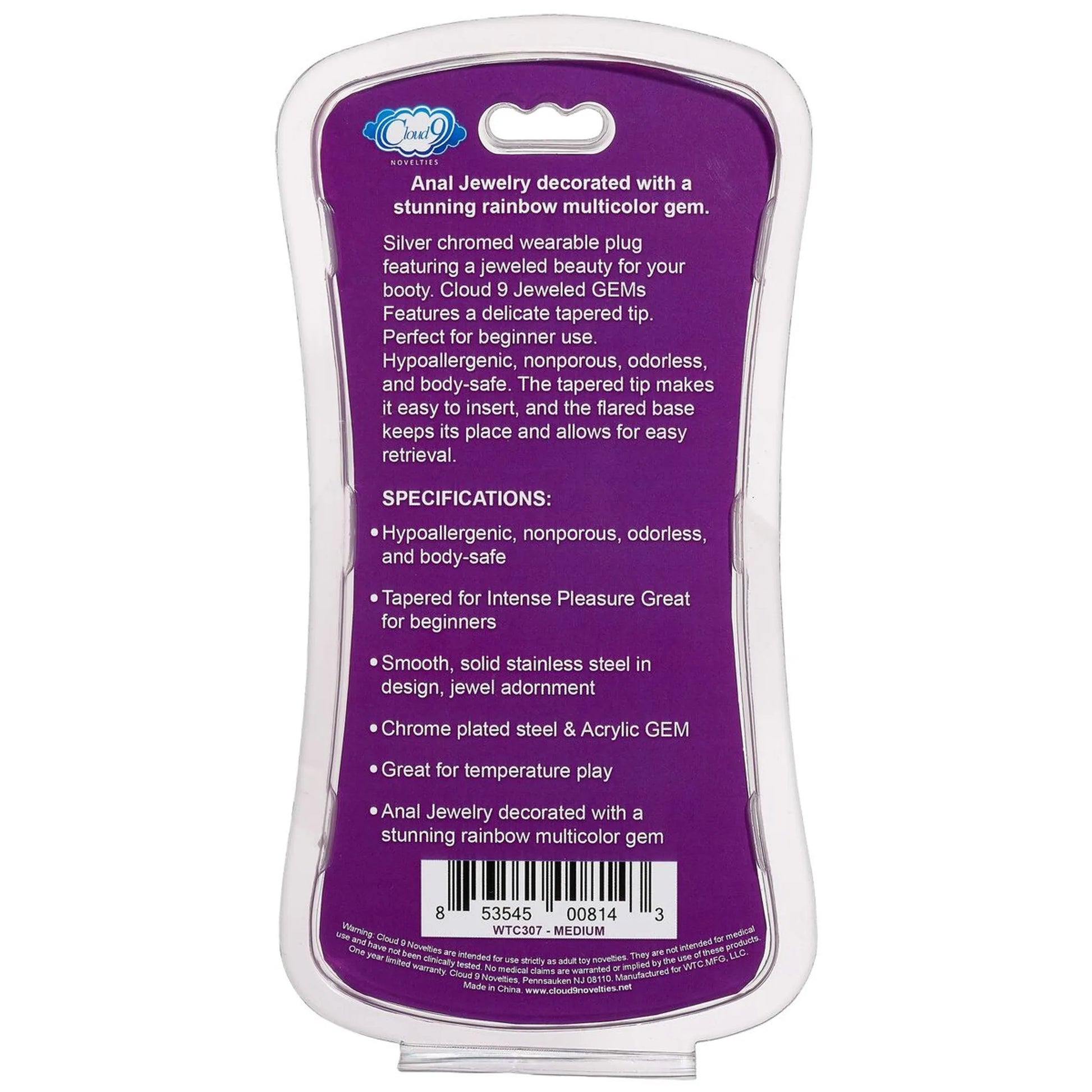 Cloud 9 Gems Silver Chrome Tall Anal Plug Medium. New Gems Silver Chromed Anal Plug Tall Tapered Design. Plug with anal jewelry decorated with a stunning rainbow multicolored gem. Hypoallergenic, nonporous, odorless and body safe. Tapered for intense pleasure. Great for beginners. Anal Jewelry decorated with a stunning rainbow multicolor gem. Silver chromed wearable plug featuring a jeweled beauty for your booty. Cloud 9 Jeweled Gems. Features a delicate tapered tip. Perfect for beginner use. Hypoallergenic, nonporous, odorless, and body safe. The tapered tip makes it easy to insert, and the flared base keeps its place and allows for easy retrieval. The sparkling jewel makes playtime fun. This Cloud 9 Jeweled Anal Plug is excellent for temperature play when you prepare it in hot or cold water. This Cloud 9 Gem anal plug is both visually stunning and ideal for stimulating anal play. Compatible with water based lubricants. Clean with mild soap and warm water after use. Smooth, solid stainless steel in design, jewel adornment. Chrome Plated Stainless Steel & Acrylic Gem. Great for temperature play. Anal Jewelry decorated with a stunning rainbow multicolor gem. Body safe Stainless Steel and Acrylic Gem. Great for temperature play. Weight .26 pound. Height 4.4 inches, diameter 1.38 inches. Video. Categories: Anal Toys, Sex Toys for Couples, Small, Medium Butt Plugs. Amazon Restricted. 2023.