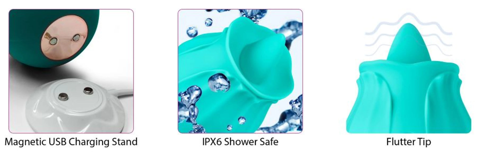 Cloud 9 Health and Wellness Flutter Oral Tongue Stimulator Teal. The Oral Tongue Stimulator reproduces a realistic oral sex experience for use with clitoral or nipple stimulation. Apply a small amount of water based personal lubricant to the soft flickering Silicone Tongue. Switch the stimulator on and experience orgasms sensations as the Tongue licks your clitoris or nipples. Features body safe, hypoallergenic, hygienic and odorless. 10 adjustable stimulation modes. Rechargeable battery includes magnetic charger base. Size 77mm by 57 mm e or approximately 3.03 inches by 2.24 inches. 30 days warranty. Categories: Rechargeable Vibrators, Tongue Vibrators, Oral Products, Sex Toys for Women. New video. MAPs price $54.95 added. New image added with 3 specifications of the Tongue Clitoral Stimulator: magnetic USB Chargeable, IPX6 Shower safe. Flutter Tip Clitoral Stimulator. Primary image changed. Restricted, Amazon Restricted. 2022._x000D_