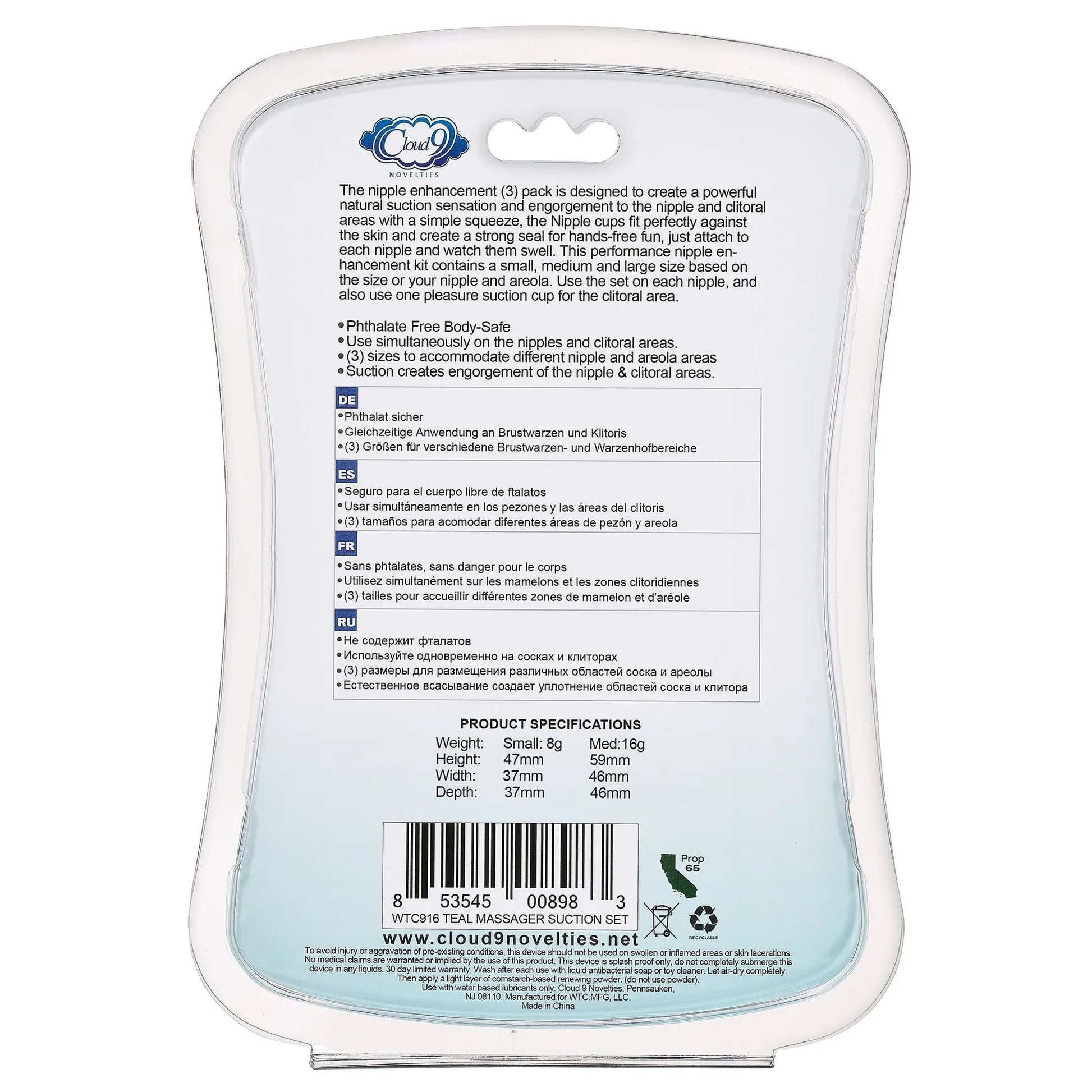 Cloud 9 Health and Wellness Nipple & Clitoral Massager Suction Set Teal. The nipple enhancement 3 pack is designed to create a powerful natural suction and engorgement to nipples and clitoral areas with a simple squeeze, the nipple cups fit perfectly against the skin to create a strong seal for hands free fun, just attach to each nipple and watch them swell. This performance nipple enhancement kit contains a small, medium and large size based on the size of your nipple and areola use the set on each nipple and also use one of the pleasure cup for the clitoral area. Massage suction cup set features 2 sizes of cups. Made from body safe, premium Silicone. Latex free and phthalate free. Categories: Body Massagers, Nipple Play, Sensual Kits, Massage Kits. 30 days warranty. Video. MAPs price 24.95 added. 2022.