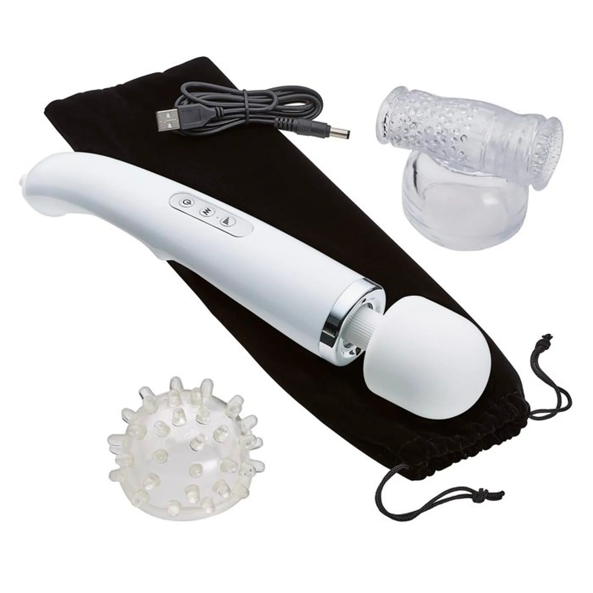 Cloud 9 Novelties Premium Health and Wellness Wand Kit with 2 Bonus Tips 30 Functions. Wand Body Massager is rechargeable. Personal power wand body massage kit with 2 bonus soft flexible tips. Personal Power Wand Massager delivers steady, soothing relaxation to tired muscles and sensual areas. Compact and light weight, it has a powerful motor reaching speeds up to 6,000 RPM. Features include 30 modes, with five speed controls. The massage head is soft and flexible providing extra comfort and soothing sensations whenever you need it. Comes complete with two bonus tips, for him and her, making couples massage more sensual and intimate. Includes 2 bonus massage tips: soft massager tip for her, male stimulator pleasure tip for him. Specifications: flexible, silicone massager head. Five function speed control. 30 vibration patterns with easy 3 button control. Full size wand measures 12 inches. Cordless convenience with rechargeable battery. Includes 2 removable bonus tips for different sensations. Bonus storage bag. Care and cleaning: thoroughly clean before and after each use. Materials Silicone head, ABS plastic handle. We recommend using Cloud 9 Toy Cleaner, sold separately. Store in a cool, dry place. Video. MAPs price $59.00 added. Categories: Magic Wands, Body Massagers, Wand Body Massagers, Sensual Kits, Vibrator Kits. Restricted, Amazon Restricted. 2022.