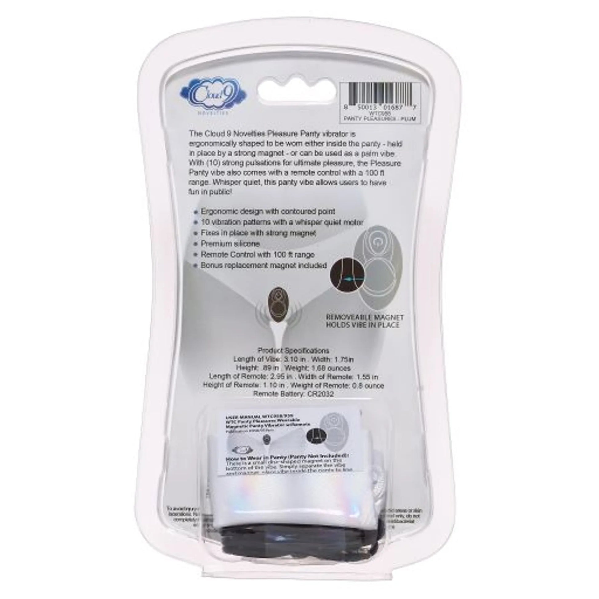 Cloud 9 Panty Pleasures Magnetic Panty Vibe Plum Purple from Cloud Nine Novelties. Wearable Vibe. Remote control. Panty not included. The Cloud 9 Novelties Pleasure Panty vibrator is ergonomically shaped to be worn either inside the panty: held in place by a strong magnet or can be used as a palm vibe. With 10 strong pulsations for ultimate pleasure, the Pleasure Panty vibe also comes with a remote control with a 100 feet range. Whisper quiet, this panty vibe allows users to have fun in public! Features: ergonomic design with contoured point. 10 vibration patterns with a whisper quiet motor. Fixes in place with strong magnet. Made using body safe, phthalate free Premium Silicone. Remote Control with 100 feet range. Bonus silk storage pouch included. Categories: Rechargeable Vibrators, Palm Size Massagers, Sex Toys for Women, Vibrating Underwear. New images added for extra details and information. Spin Video added. Restricted, Amazon Restricted. 2022.