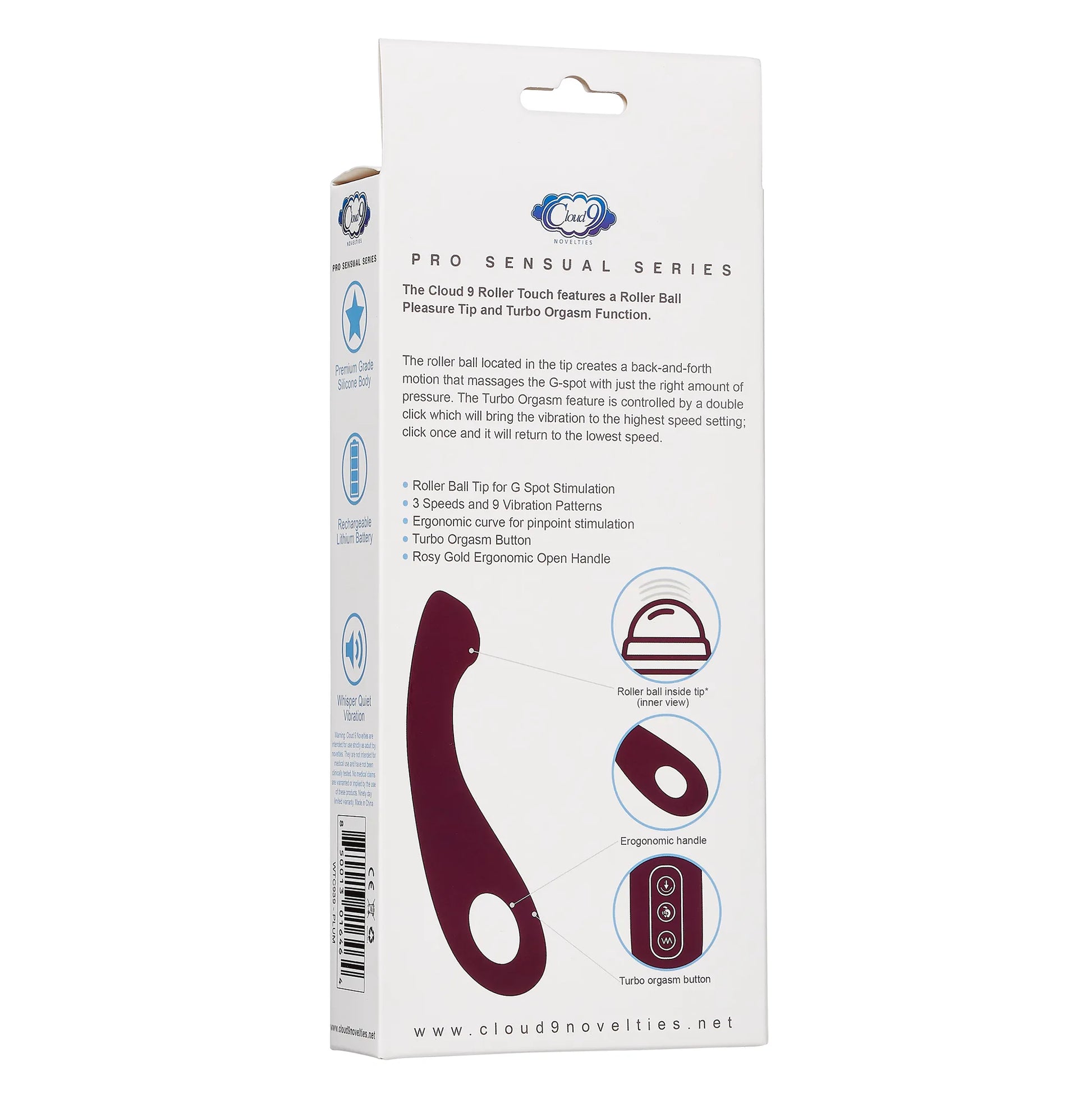 Cloud 9 Pro Sensual Roller Ball G-Spot Turbo Plum Vibrator. Pro Sensual Series Roller Touch G-Spot Tri-Function Roller Ball Tip Turbo Orgasm Function. The roller ball located in the tip creates a back and forth motion that massages the G-Spot with just the right amount of pressure. The Roller Touch also features a Turbo Orgasm mode, where a simple double click of a button will turn the vibrations up to the highest speed. Features for the Roller Ball Tip for G-Spot Stimulation with 3 speeds and 9 vibration patterns. Ergonomic curve for pinpoint stimulation. Turbo Orgasm Button. Plus a Rosy Gold ergonomic open handle. User manual below: Roller Touch for G-Spot stimulation: turning the Roller Touch On/Off: press and hold the center button. The button will glow red indicating the Roller Touch is in standby mode. To turn the Roller Touch off, press and hold the center button until the light goes off. How to cycle the vibration patterns: the bottom button on the handle operates the vibration settings. After the Roller Touch is in standby mode, one click of the button will turn on the vibrations at the lowest speed. To cycle through the vibration functions, just continue to click the button until the desired speed and/or pattern is reached. To turn off the vibration function, press and hold the button until the vibrations stop. How to activate the turbo orgasm feature: to engage the Turbo Orgasm feature, double click the vibration button. The Roller Touch will jump to the highest setting. To disengage the Turbo feature, just click the button once and the Roller Touch will return to low speed. How to operate the Roller Ball function: the top most button on the handle controls the roller ball functions. Like the vibration settings, just click this button once to turn on the roller ball. To cycle through the different functions, continue to click the button until the desired pattern is reached. To turn the Roller Ball function off, press and hold the button till the roller ball stops moving and the light turns off. Both the Roller Ball and Vibration functions feature 3 speeds and 9 patterns. 30 days warranty. MAPs price $99.95. Categories: Vibrators, Rechargeable Vibrators, G-Spot, Sextoys for Women. Restricted, Amazon Restricted. 2022.