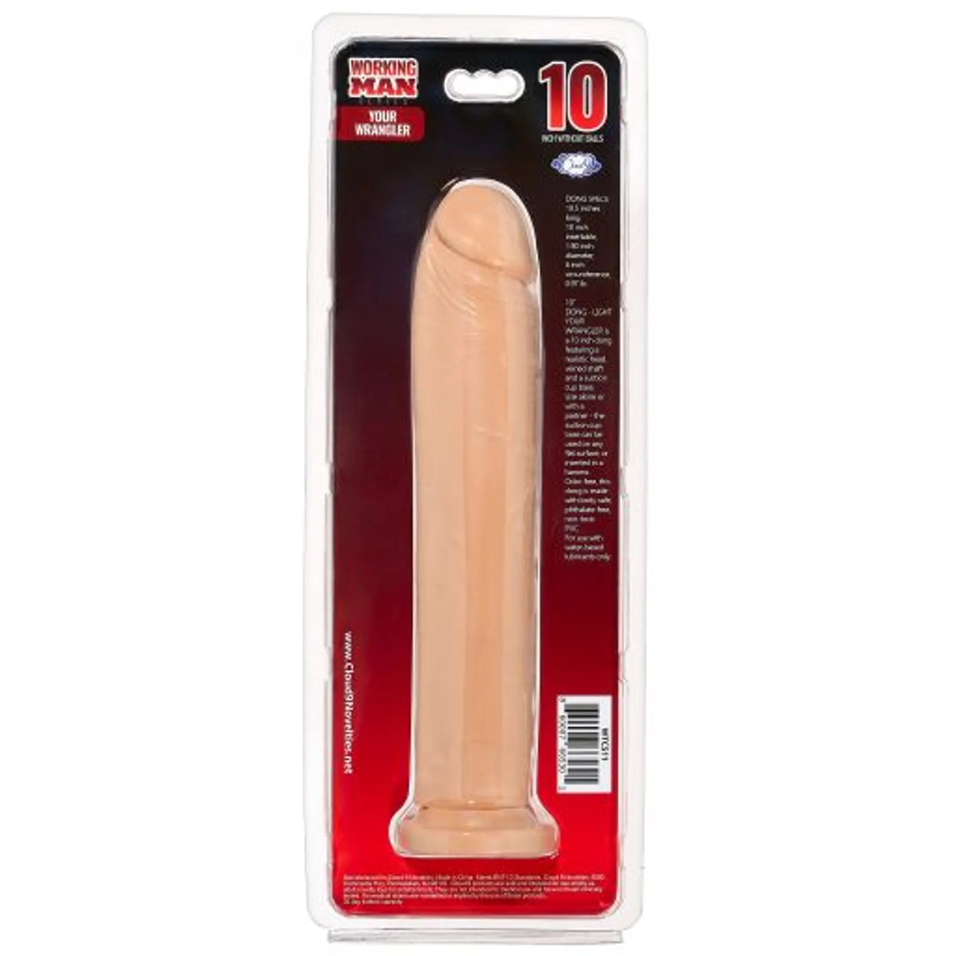 Cloud 9 Working Man 10 inches Light Skin Dildo Your Wrangler without Balls. Dong specifications: 10.5 inches long, 10 inches insertable, 1.90 inches diameter, 6 inches circumference, 0.97 pound. 10 inches Dong Light Skin Tone Beige. Your Wrangler is a 10 inches dong featuring a realistic head, veined shaft and a suction cup base. Use alone or with a partner, the suction cup base can be used on any flat surface, or inserted in a harness. Odor free, this dong is made with body safe, phthalate free, non-toxic PVC. For use with water based lubricants only. Do not use a Silicone Based Personal Lubricant with this adult toy. Manufactured for Cloud 9 Novelties. Made in China Meets EN71-3 Standards. Cloud 9 Novelties, 9250 Commerce Hwy, Pennsauken, NJ 08110. Cloud 9 products are sold and intended for use strictly as adult novelty toys for entertainment. They are not intended for medical use and have not been clinically tested. No medical claims are warranted or implied by the use of these products. Categories: Dildos, Dongs, Realistic Large Dong, Dildos and Dongs Realistic. Spin Video added. Primary image package. 2022.