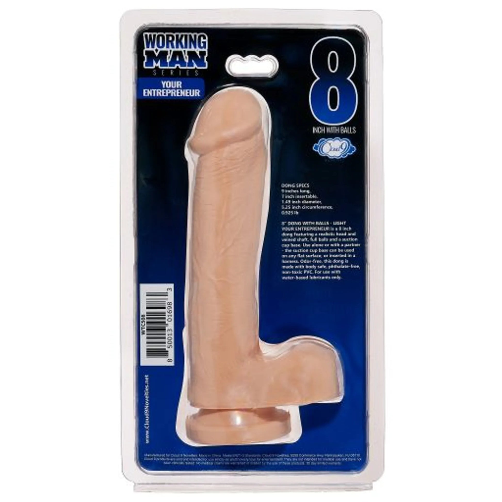 Cloud 9 Working Man 8 inches Light Skin Tone Beige Dildo with Balls Your Entrepreneur. Dong specifications: 9 inches long, 7 inches insertable, 1.49 inches diameter, 5.25 inches circumference, 0.925 pound. 8 inches Dong with Balls Light Skin Tone Beige. Your Entrepreneur is a 8 inches dong featuring a realistic head and veined shaft, full balls and a suction cup base. Use alone or with a partner, the suction cup base can be used on any flat surface, or inserted in a harness. Odor free, this dong is made with body safe, phthalate free, non-toxic PVC. For use with water based lubricants only. Do not use Silicone Based Personal Lubricants. Manufactured for Cloud 9 Novelties. Made in China Meets EN71-3 Standards. Cloud 9 Novelties, 9250 Commerce Hwy, Pennsauken, NJ 08110. Cloud 9 products are sold and intended for use strictly as adult novelty toys for entertainment. They are not intended for medical use and have not been clinically tested. No medical claims are warranted or implied by the use of these products. Size 9 inches, 7 inches insertion length, 1.49 inches in diameter and 5.25 inches circumference. Categories Working Man Dildo: Dildos, Dongs, Realistic Dildo Large, Dildos and Dongs Realistic. Spin Video added. Primary image package. 2023.
