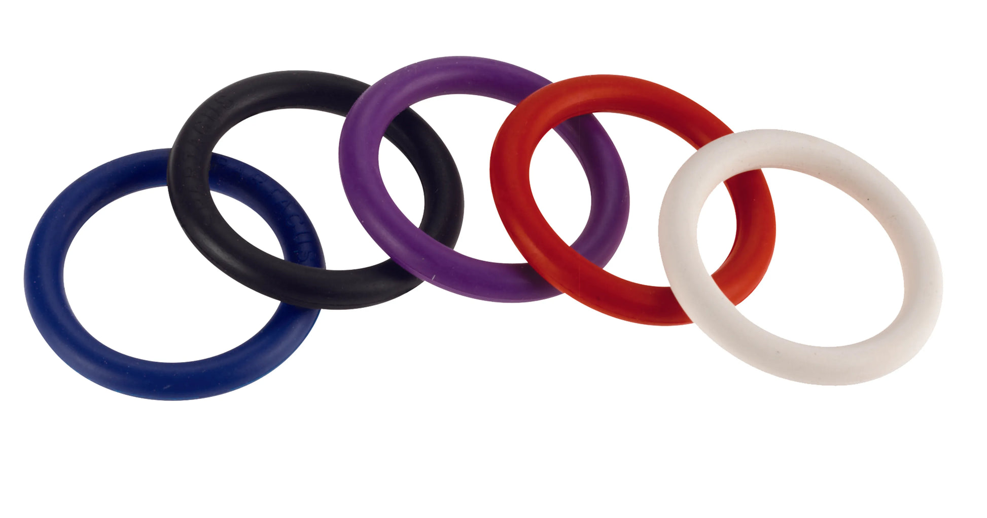 Spartacus Leathers Cock Rings Nitrile 5 Pack Rainbow. In response to the popularity of their rainbow pack of rubber cock rings, they have introduced a 5 pack in nitrile. Colorful, flexible nitrile cock rings are the perfect skin safe solution for those with rubber allergies, and they offer a firmer experience than our rubber rings. These amazingly durable cock rings are made of 100% skin-safe nitrile, the same material used in hospital gloves. Nitrile cock-rings are strong yet flexible, snapping back to shape after each use. Nitrile is a latex-free, strong and flexible material. Because it is latex-free, nitrile is a preferred cock ring material for men with rubber allergies. And not to worry, they are compatible with silicone & water-based lubes! Set includes 5 1.25 inches rings. One each colors: Black, Blue, Purple, Red and White. Spartacus Leathers A Passion For Quality page 21.