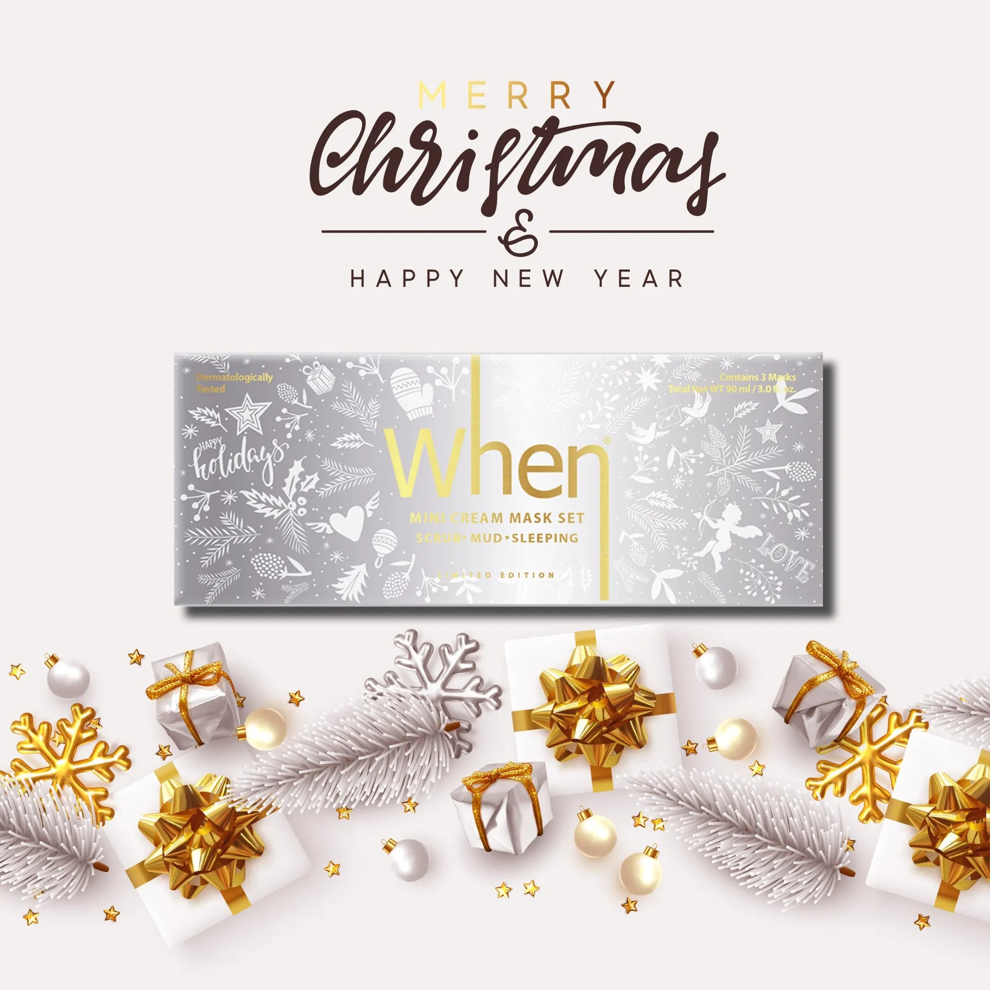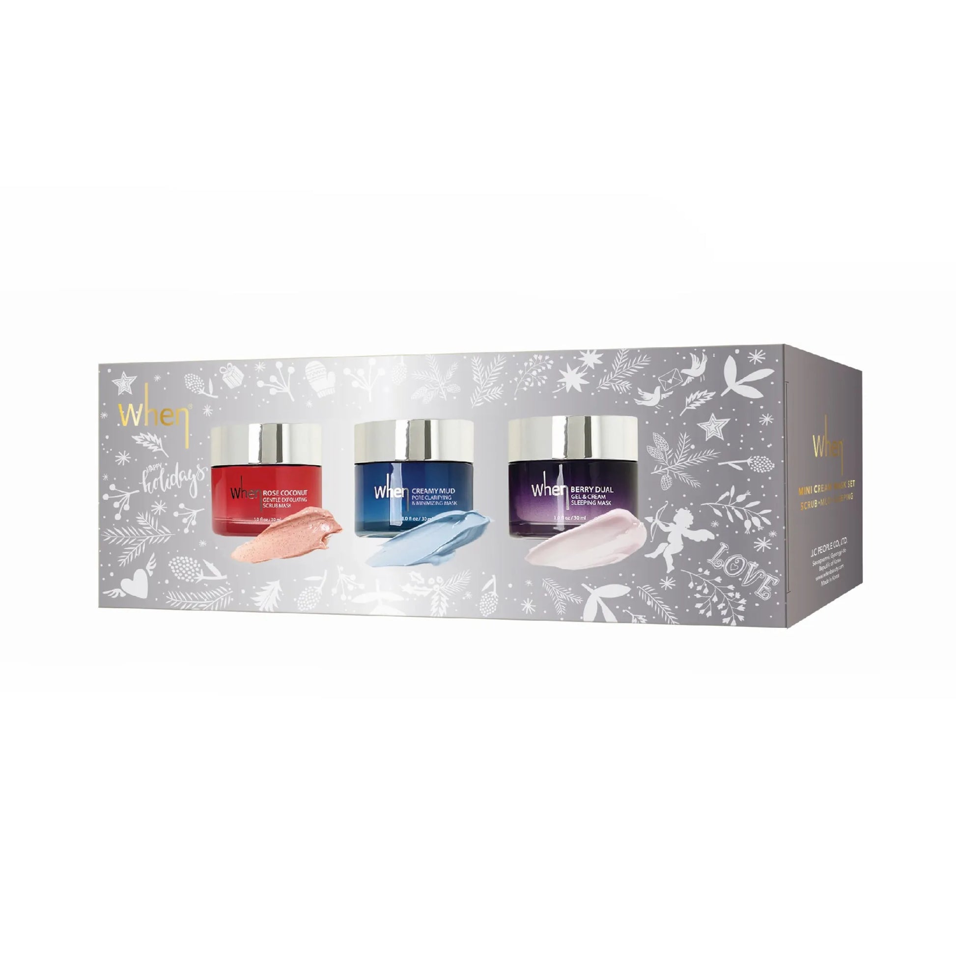 Holiday Limited Edition of When Beauty Cream Mask Trio Set with Deep Pore Cleansing & Minimizing Creamy Mud Mask, Gentle Exfoliating Rose Coconut Scrub Mask, and Clinically-Proven Nourishing & Anti-Aging Berry Dual Gel & Cream Sleeping Mask with Unique Textures and Innovative Formulations using world's purest ingredients and natural essential oils.