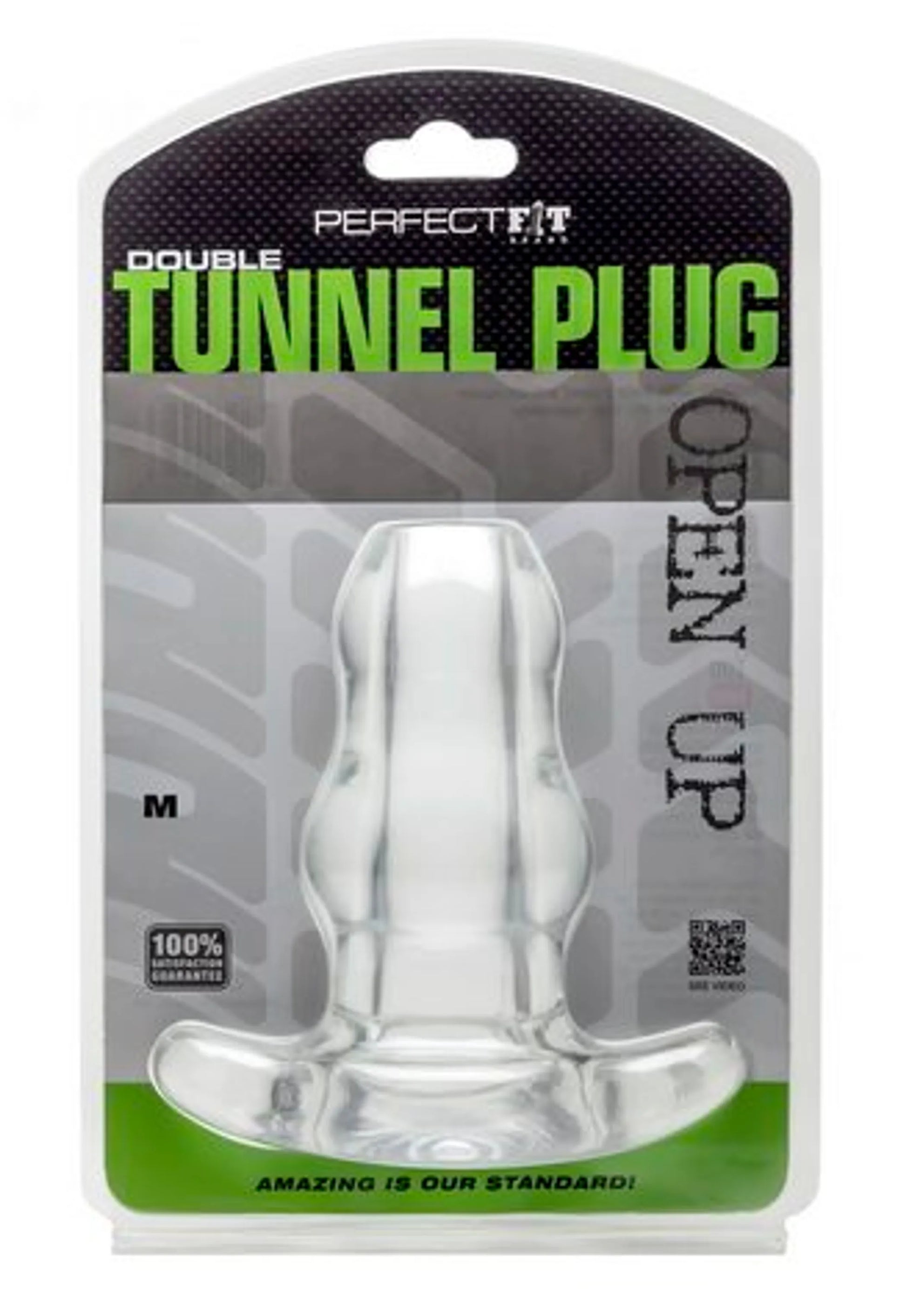 The Double Tunnel Plug Clear. Butt plug features two plugs that slightly taper to the tip which makes it one of the most innovative butt plugs available on the market. In addition to being a standard butt plug, you can use the tunnel hole that goes all the way through the plug for various play including lube insertion, fingers and water sports. The clear version also makes it possible to see right into the other person. It is made of special blend of silicone and Thermoplastic Rubber TPR called Perfect Fit Blend. It is safe with all lubes. Wash thoroughly with mild soap and water. This product is not compatible with latex. Perfect Fit Brand Products are sold, and intended for use strictly as adult novelty toys for entertainment. They are not intended for medical use and have not been clinically tested. No medical claims are warranted or implied by the use of these products. Dimensions for Medium size double tunnel plug 3.5 inches insertion length by 6.9 inches in circumference. The Double Tunnel Plug Ice Clear Medium from Perfect Fit Brands. 18
