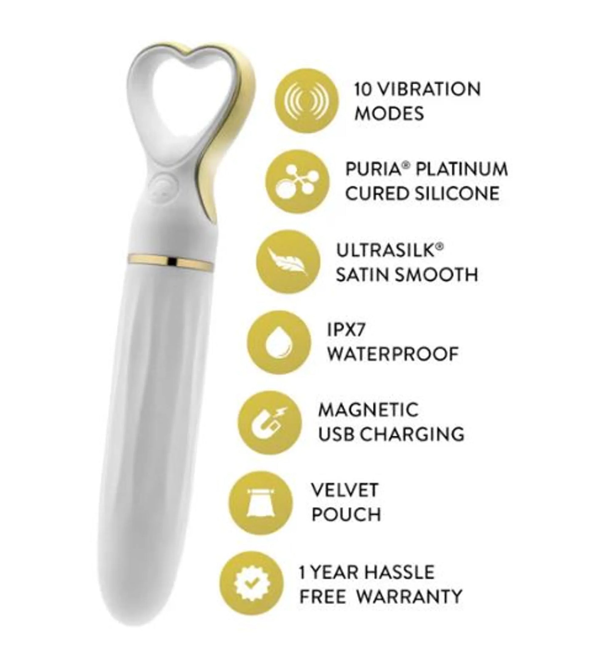 Cute, chic, and sophisticated, the Delice Heartthrob is a vibrator designed to indulge your senses. Its smooth, tapered tip delivers targeted, precise stimulation, with 10 versatile vibration modes???,??EUR?including 5 speeds and 5 patterns???,??EUR?to explore your pleasure, all at your fingertips. Crafted from premium, body-safe Puria?,?(R) platinum-cured silicone with a luxurious UltraSilk?,?(R) finish, Heartthrob feels irresistibly soft and gentle against the skin. The heart-shaped handle, accented with gold, adds a touch of elegance to your playtime. Splashproof and magnetic USB rechargeable, this vibrator ensures your pleasure is always within reach. Beautifully designed for solo indulgence or as a thoughtful gift, the lightweight and travel-ready Heartthrob is the perfect companion wherever passion may lead.