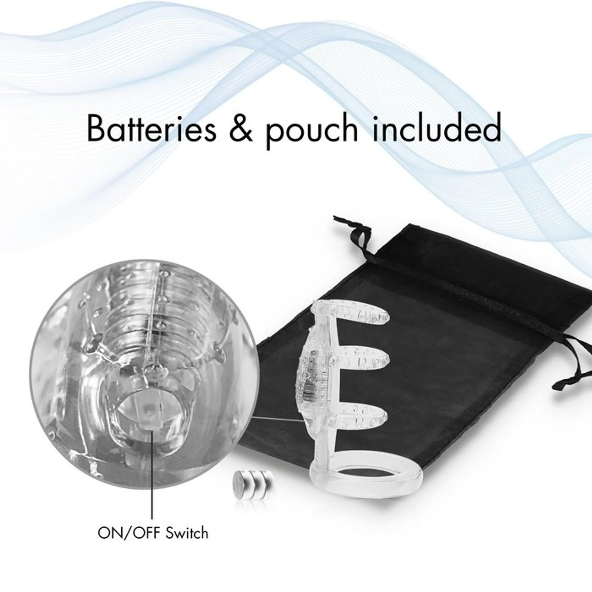 Doctor Love Zinger Vibrating Sleeve Clear. Batteries and pouch included. 11, 000 vibrations per minute. On and off switch. Easy to clean. Comfortable. One size fits most. Sleeve measures 2.25 inches wide by 3 inches in length. Top ring measures 1.25 inches in diameter. Bottom ring is 2 inches in diameter. Rings are textured for added stimulation. Please note shown on dildo, not included. Phthalate free materials Thermoplastic Elastomers TPE cage, ABS plastic bullet vibrator. Vibrating Cage requires 3 LR44 batteries. Batteries are included. Categories: Love Rings, Couples Cock Rings, Sleeves, Rings, Men's Cock & Ball Gear. 2022.