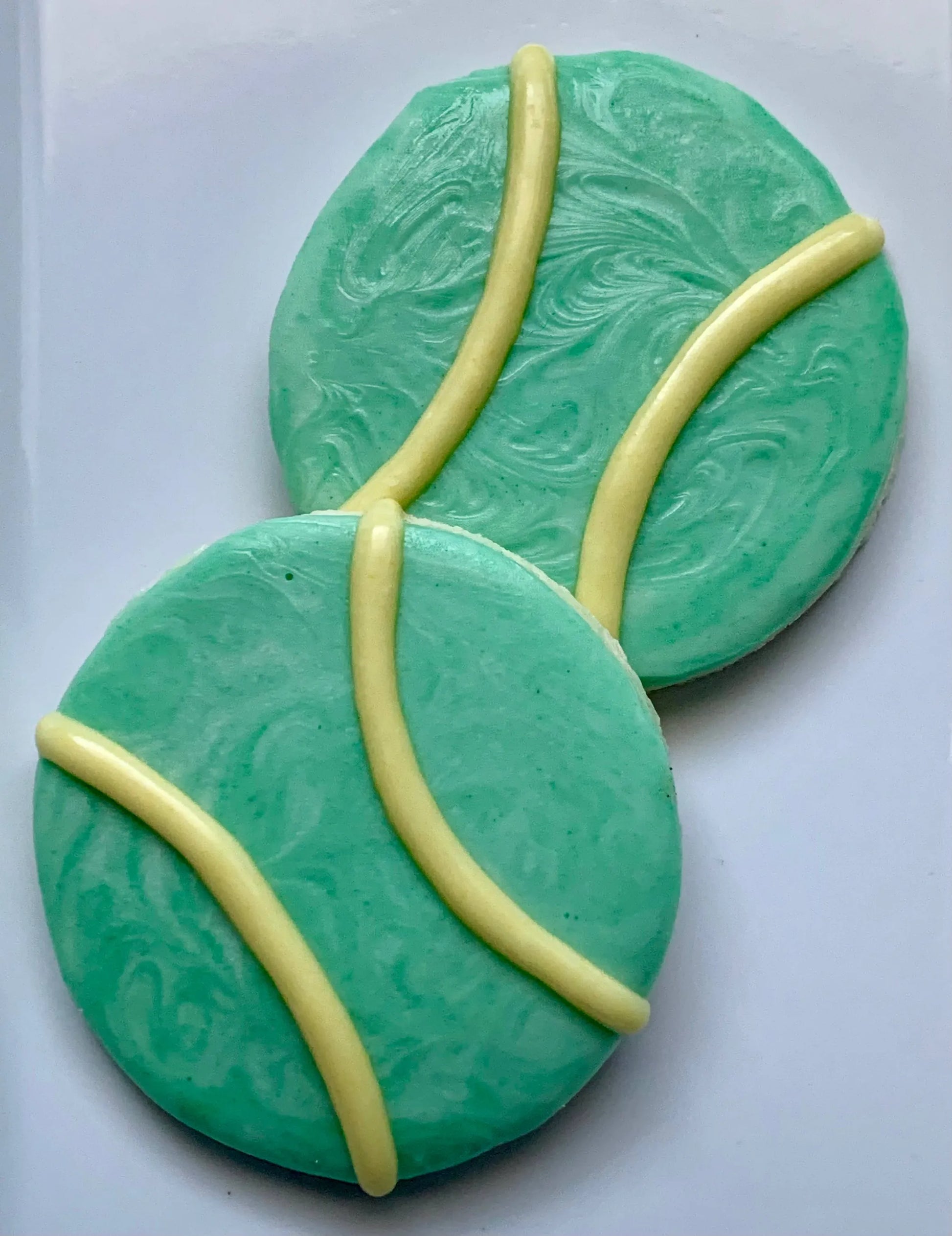 Cute round vanilla cookie covered in green vanilla icing and trimmed with yellow vanilla icing stripes.