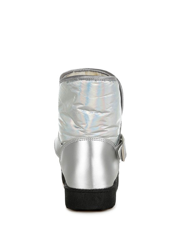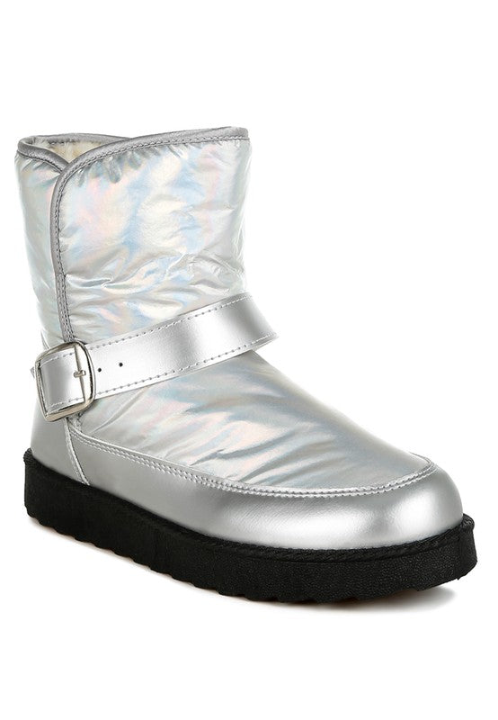 Refresh your footwear collection this season with these uber-cool faux leather puffy ankle boots. They feature a silver-tone adjustable buckle fastening on the strap, a chunky anti-skid sole, a closed rounded toe, and a faux leather finish. Pair them with jeans and a knit jumper for an everyday outfit.