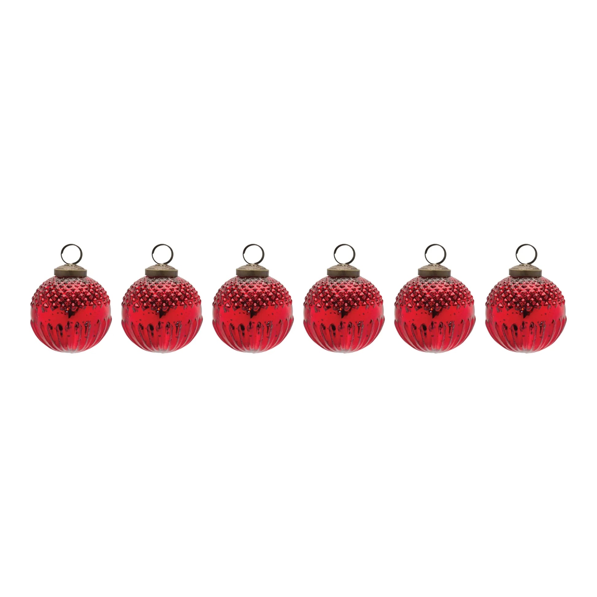 Adorn your Christmas tree and holiday decor with this stunning set of Mercury Glass Ball Ornaments. Featuring 6 pieces, the festive red tones paired with the textured design is the perfect combination to create a memorable display. The quality glass and brass composition and delicate brass ring hanging accent is sure to endure for seasons to come. Whether you're adding a touch of cheer to your home or gifting to a loved one, these ornaments will definitely bring smiles.