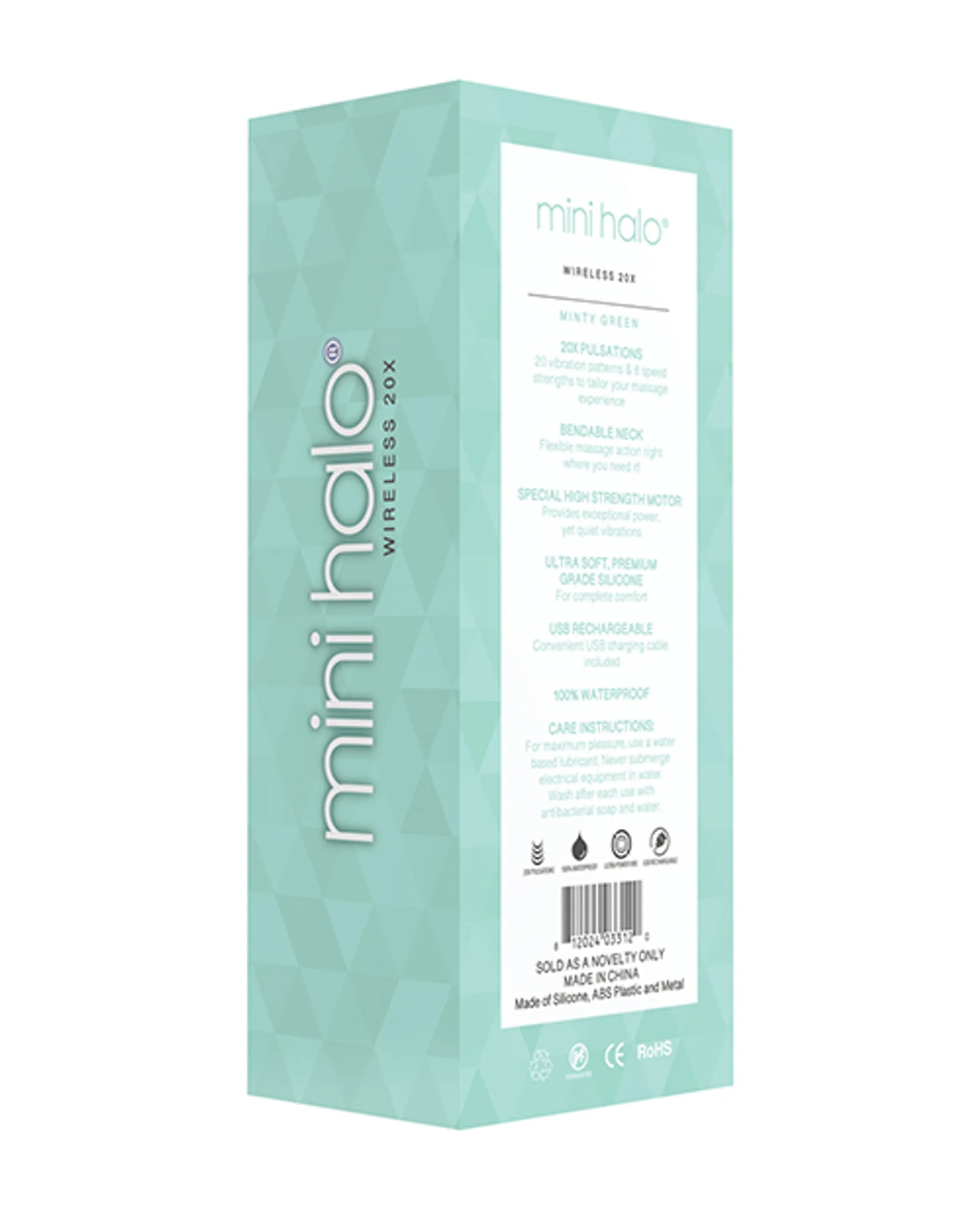 Mini Halo Minty Green from Thank Me Now - Shibari Wands. Mini Halo Wireless 20X Wand features. 20 vibration patterns and 8 speed strengths to tailor your massage experience. Bendable neck puts flexible massage action right where you need it! Special high strength motor provides exceptional power, yet quiet vibrations. Materials Silicone head, ABS plastic handle. USB rechargeable, cable included. 20 vibration patterns and 8 speed strengths to tailor your massage experience. Bendable neck for flexible massage action right where you need it. Special high strength motor provides exceptional power, yet quiet vibrations. Ultra soft, premium grade Silicone for complete comfort. The Mini Halo Massage Wand is rechargeable and comes with a USB power cord with optional attachable plug in. These Mini Wands are 100% water resistant. For use in the shower. Size 6 inches by 2 inches by 1 inch. Thank Me Now - Shibari Mini Wand. 2022.