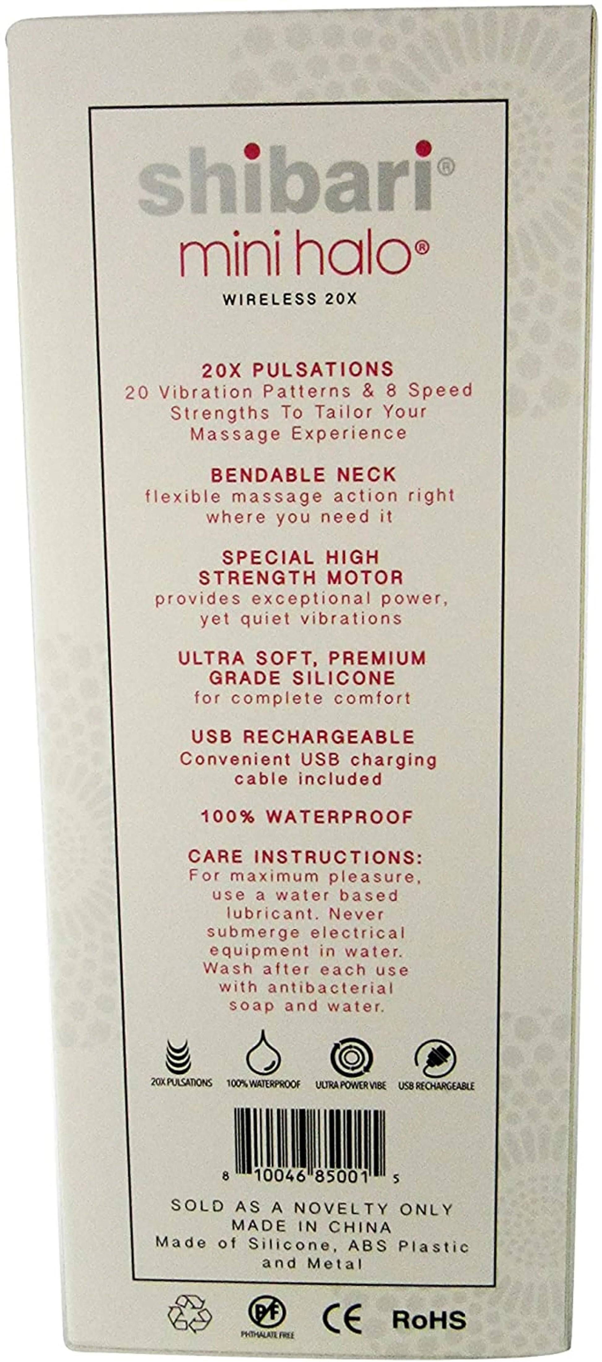 Mini Halo Pink Pink from Thank Me Now - Shibari Wands. Mini Halo Wireless 20X Wand 20 vibration patterns and 8 speed strengths to tailor your massage experience. Bendable neck puts flexible massage action right where you need it! Special high strength motor provides exceptional power, yet quiet vibrations. Material: Silicone, USB rechargeable, cable included. 20 vibration patterns and 8 speed strengths to tailor your massage experience. Bendable neck for flexible massage action right where you need it. Special high strength motor provides exceptional power, yet quiet vibrations. Ultra soft, premium grade Silicone for complete comfort. The Mini Halo Massage Wand is rechargeable and comes with a USB power cord with optional attachable plug in. These Mini Wands are 100% water resistant. For use in the shower. Size 6 inches by 2 inches by 1 inch. Thank Me Now - Shibari Mini Wand. 2022.
