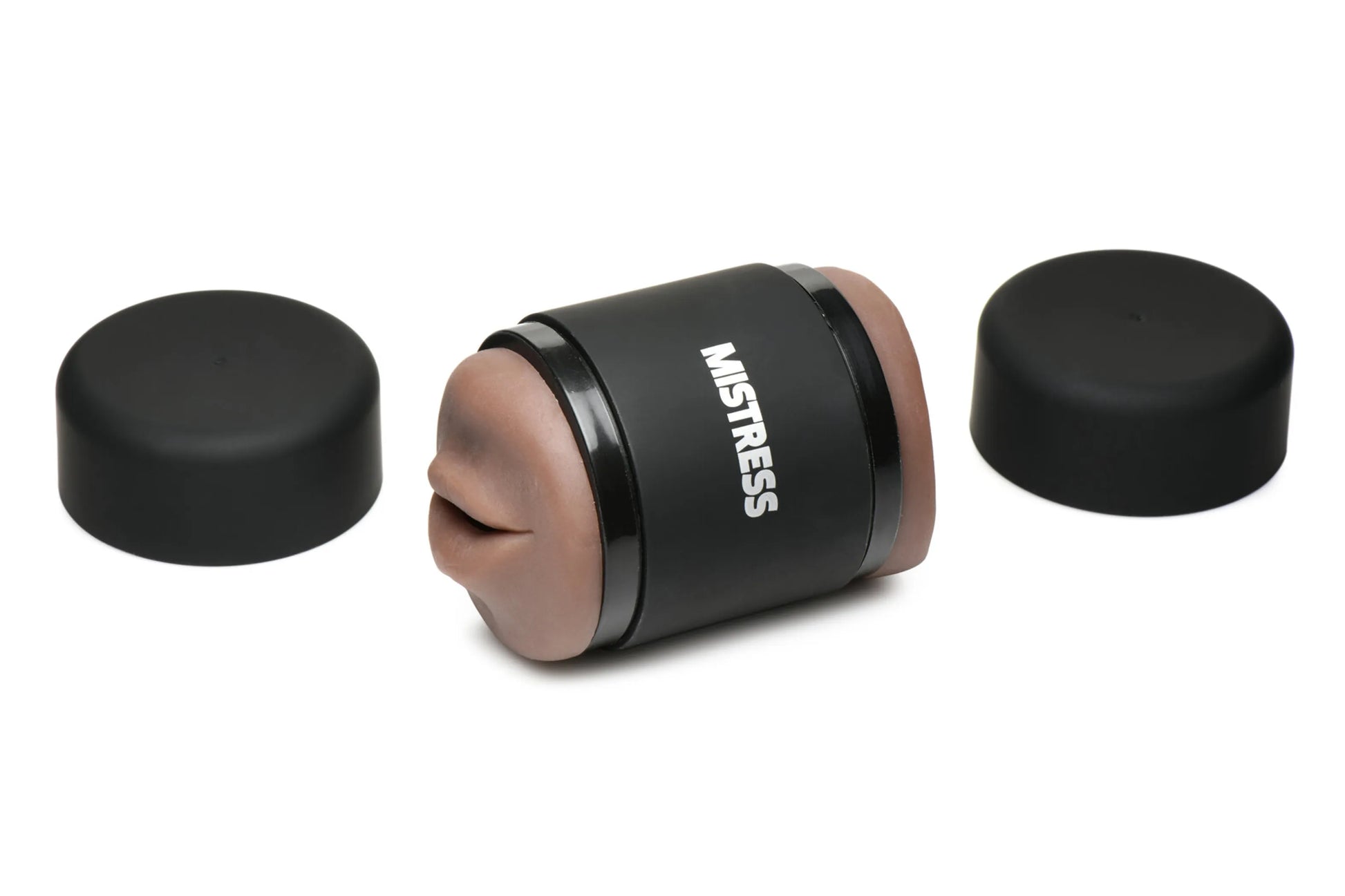 Mistress Double Shot Ass and Mouth Dark Skin Tone Mini Masturbator from Curve Novelties. Brand: Mistress. SKU: CN-07-0583-11. UPC: 653078943146. Mini Double Ended Masturbator. _x000D_