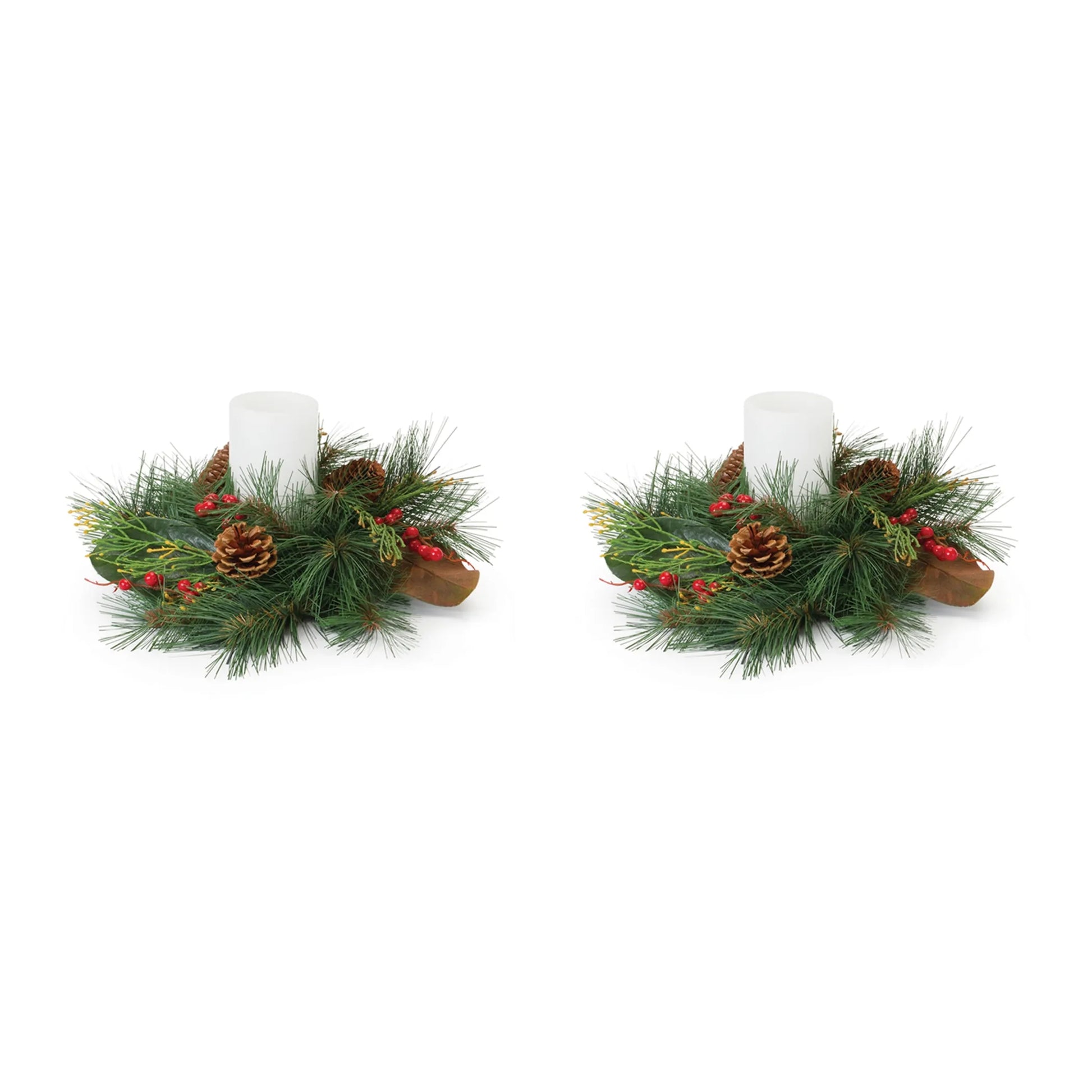 Add a touch of nature to your tabletop holiday display with this stunning set of Mixed Pine and Magnolia Candle Rings. Featuring natural green and brown tones and magnolia leaf and pinecone accents, this candle ring is sure to fit right in with your holiday decor. The quality PVC plastic compsosition is sure to endure for seasons to come. Illuminate the piece by adding a real wax or LED candle to the center of the ring. Fits up to a 4" pillar candle, not included.