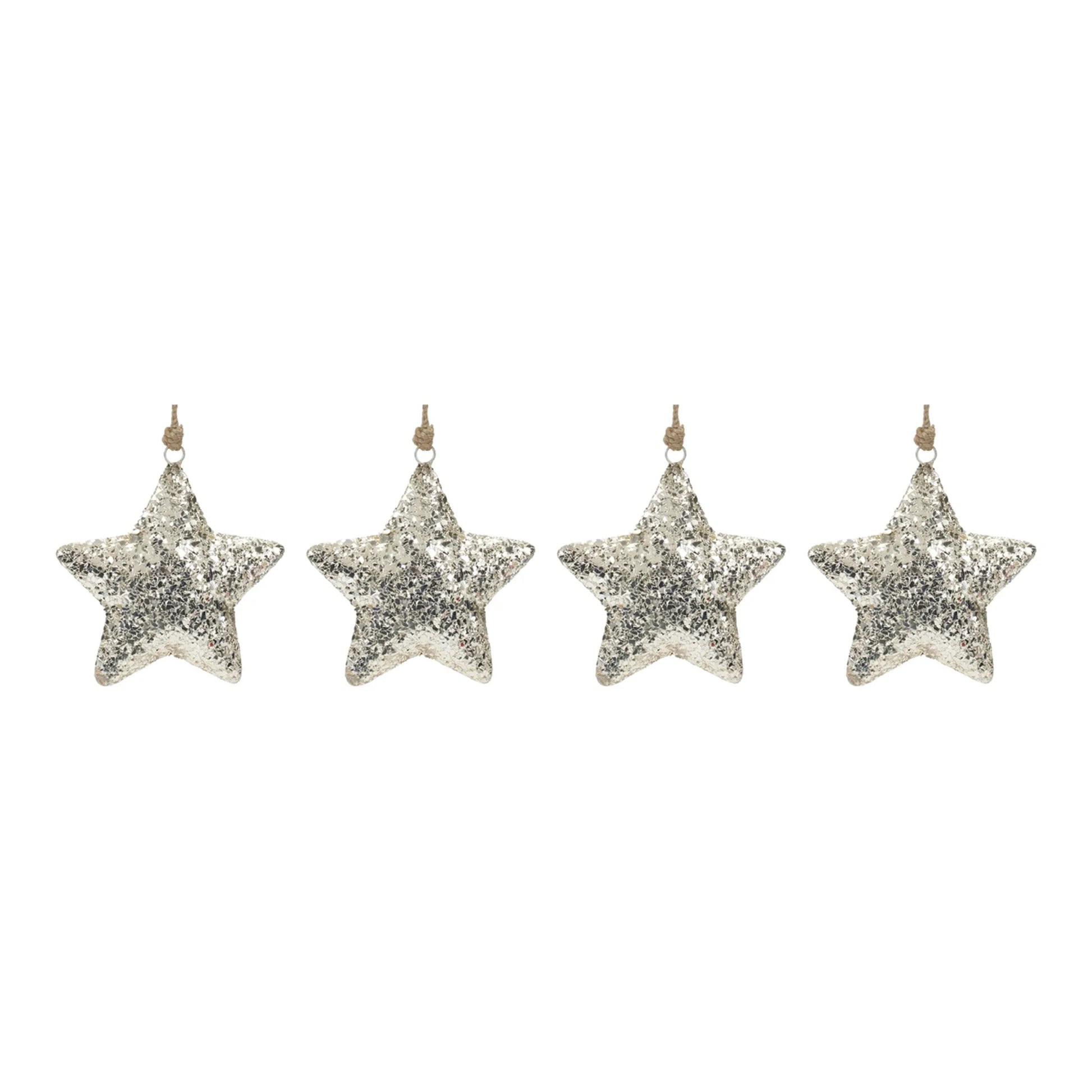 Add a chic touch to your Christmas Tree with this beautiful set of Mosaic Metal Star Ornaments. Featuring 4 pieces, this set's chic silver tones, traditional star shape, and mosaic glass design are the perfect combination to create a memorable display. The quality iron metal composition with rustic jute string hanger is sure to endure for seasons to come. Whether you're adding a touch of cheer to your home or gifting to a loved one, these ornaments will definitely bring smiles to your home.