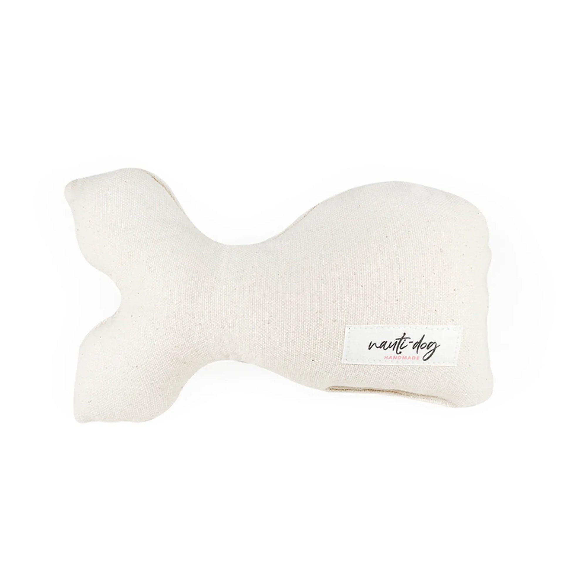 This ivory woven canvas stuffy is the perfect neutral compliment to any nauti-dog handmade essential. Made from durable canvas fabric and stuffed with a squeaker and plush poly-fill, this toy is both snuggly and fun. Available in the shape of a whale, bone or bumper.