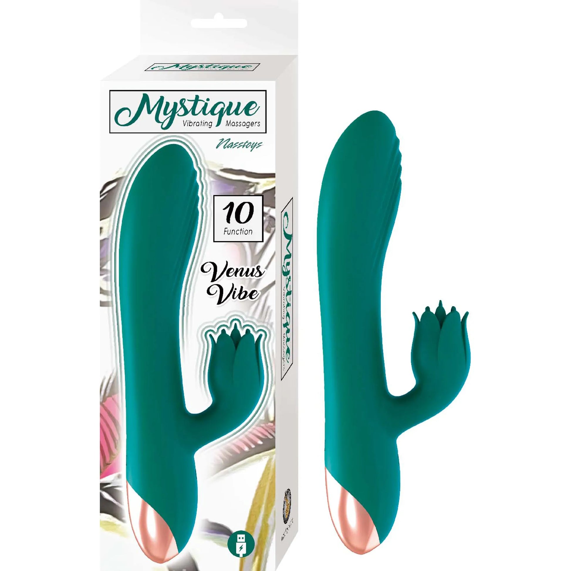 Mystique Venus Vibe Green Vibrating Massager from Nasstoys of New York. A Vibrator that truly aims to please. The Nasstoys Mystique Vibrating Massagers Venus Vibe will delight your senses and ignite your desires. A girthy, textured head sits a top a slender, flexible shaft that comfortably moves with your body for prime G-Spot or P-Spot stimulation. This sex toy is also anal safe because the external stimulator act as a flared base for safety. The beautiful external petal attachment includes a flicking tongue that offers provides fluttery sensations. Made from super soft Silicone you will soon bloom with satisfaction. Control the 10 vibrating functions of the two motors independently to fully customize your unique experience. The Nasstoys Mystique Vibrating Massagers Venus Vibe brings a whole new meaning to the phrase flower power. The soft Silicone feels like velvet against your skin. No need to fumble around for batteries, this blooming beauty is fully rechargeable. Charge fully before first use to prime the battery of your new toy. Use this sex toy your favorite water based personal lubricant for the most pleasurable experience. After use just carefully wash the adult toy with mild soap and water or try some Toy Cleaner for even quicker clean up. Specifications: 10 function. Dual motors. Body safe Silicone. RoHS compliant. Phthalates free. Waterproof vibrations. Materials: Silicone Shaft and Rabbit and ABS Plastic base. Size: length 9.25 inches, width 1.125 inches, height 2.5 inches. Rechargeable vibration. Charing time 1 hour, working time 45 minutes. Voltage: 3.7V. Categories: Vibrators, Rabbit Style Vibrators, Rechargeable Vibrators, Sex Toys for Women, G-Spot Rabbit Style Vibrators. 2023.